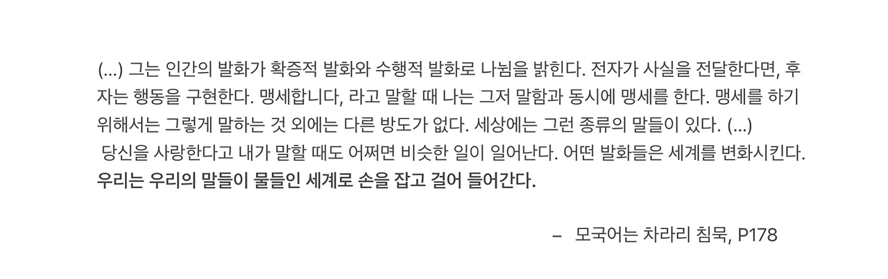 한편, <모국어는 차라리 침묵>이라는 책에는 우리가 ‘우리의 말들이 물들인 세계로 손을 잡고 걸어 들어간다‘는 구절이 등장한다.