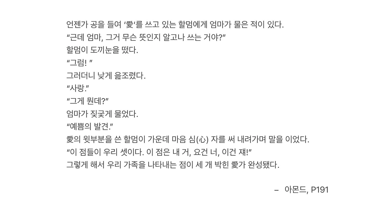 온전한 자기를 경험한다는 것은 그런 것이다. 나의 단점을 외면하거나 부인하지 않고 장점과 마찬가지로 그저 안아주는 것. 이렇듯 결함투성이인 나를 사랑하고 결함투성이인 사람들을 사랑하자, 어느새 삶이란 행복하지 않기가 오히려 더 어려운 무언가가 되어 있었다. 고개만 돌려도 내가 사랑할 것들 천지인 세상이 내 눈앞에 펼쳐지기 시작했으니까. 눈앞의 당신을 순수하게 좋아하게 되면서 당신의 존재 자체가 내게 행복으로 다가오기 시작했으니까. 소설 <아몬드>에서는 사랑이 곧 예쁨의 발견이라고 말한다.