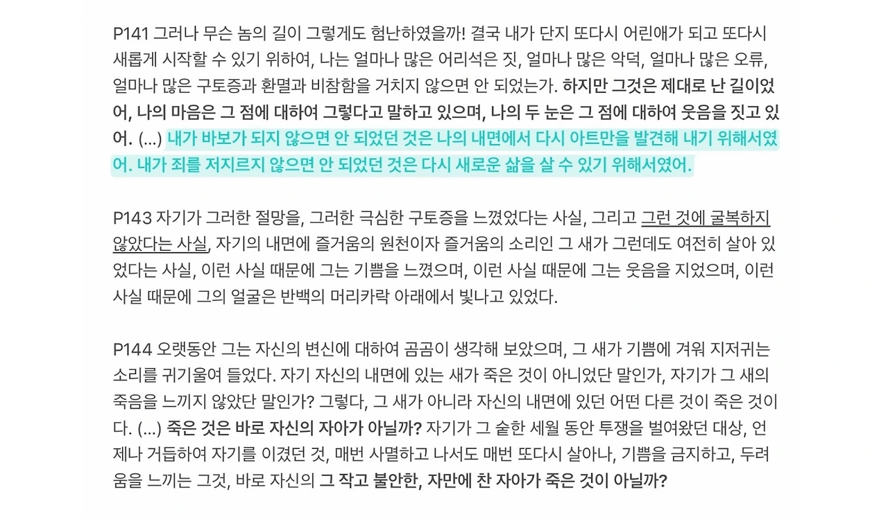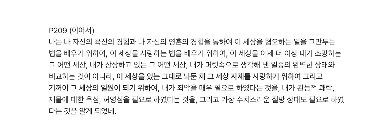 나는 타인에게 수없이 많은 피해를 주고 잘못을 저지르며 살아왔다. 이 사실을 도대체 수용할 수가 없었던 때가 내가 나를 가장 미워하고 탓하던 바로 그 시기였을 것이다. 그러나 내가 어느 누구보다 나은 사람이 아니며 남들과 아주 똑같은 사람임을 인정하자 비로소 나는 나 자신을 애정어린 시선으로 바라볼 수 있었고 자연스럽게 매일 일상에서 마주하는 결함투성이 사람들을 사랑하게 되었다. 다시 말해 내가 이러한 어려움을 경험하지 못했다면, 그러니까 누군가에게 평생 피해준 일 없이 반듯하게만 자라왔다면 나는 지금처럼 사람들을 따뜻한 시선으로 바라보지 못했을 것이라는 뜻이다. 온전한 자기를 경험해본 사람만이 온전한 타인을 경험할 수 있으며 온전한 전체로서의 세계를 경험할 수 있으니까. 같은 맥락에서 소설 <싯다르타>의 몇 구절을 소개하고 싶다.