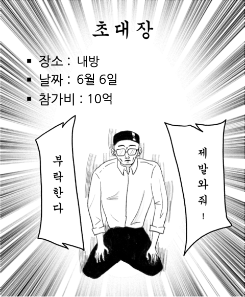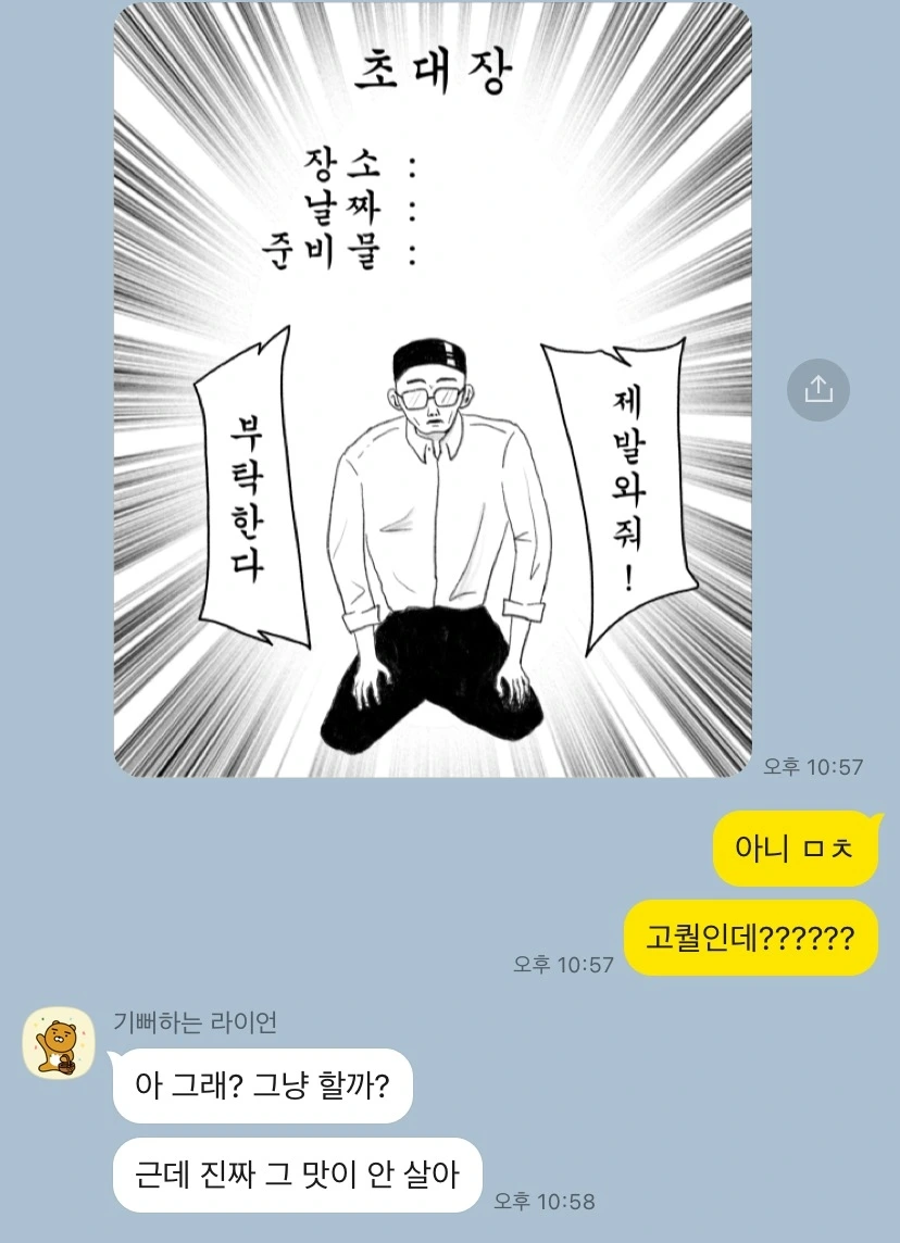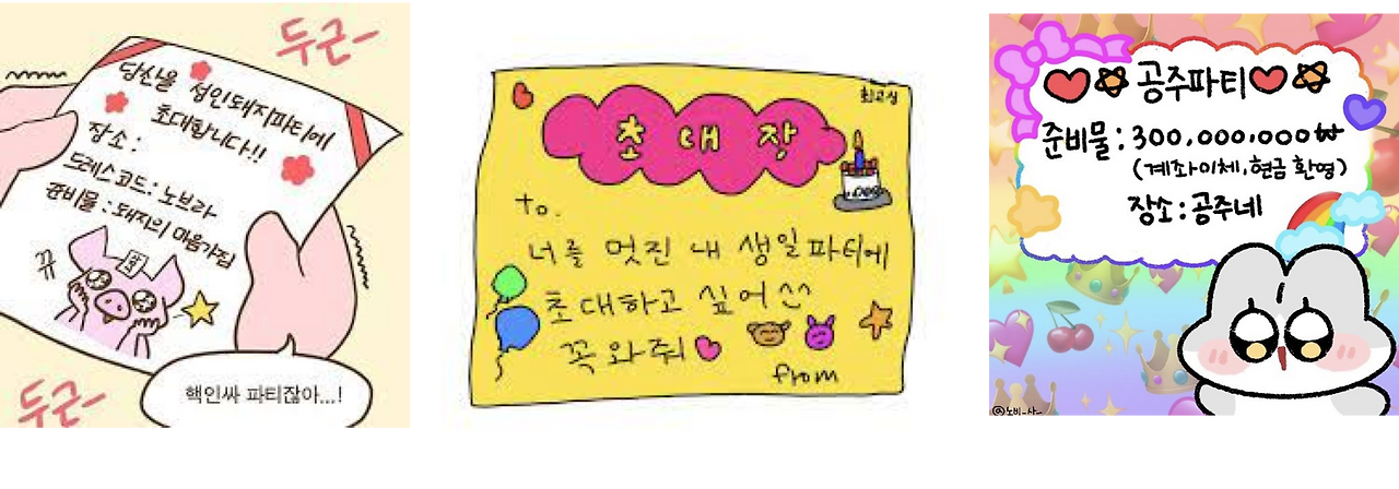 초대장 짤들아쉽게도 사용자가 직접 문구를 바꿀 수 없어서 포토샵을 이용해야 하는 상황. 우리는 누구나 우리의 B급 감성을 향유하길 바랐다.