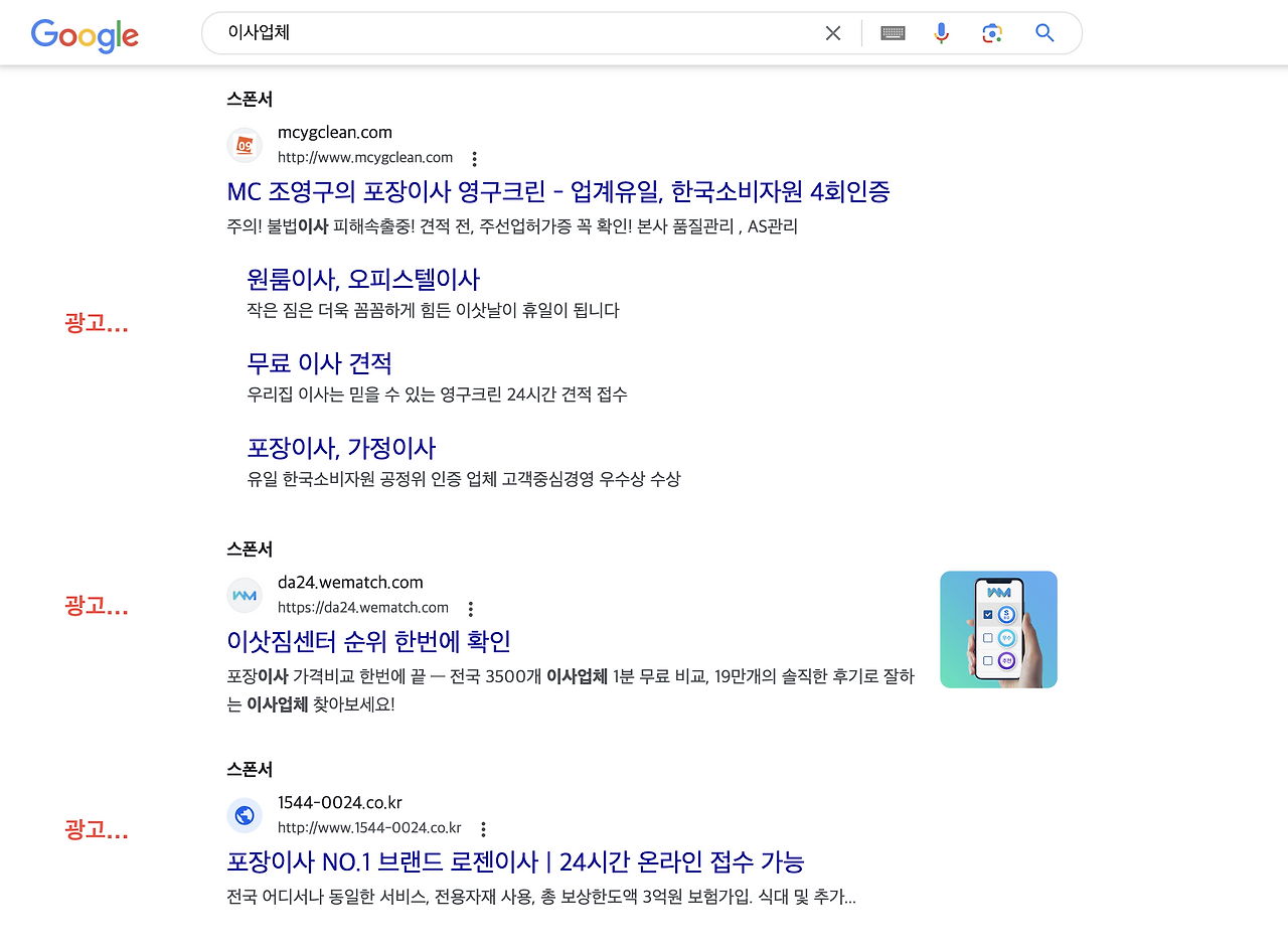 포털에 ‘이사’ 라고 검색했을 때 상위에 노출되기 위해, 이사업체들은 수백에서 수천만 원을 들여 광고를 하고 있다. 심지어 직원 수가 3~4명밖에 되지 않는 소규모 이사 업체에서도 월 수익의 절반 가까이를 이 광고비로 소진하고 있다.