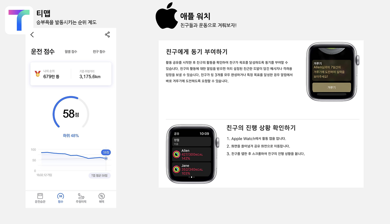 서비스가 우리에게 은근히 경쟁을 부추기기도 한다. 티맵의 경우 사용 데이터를 바탕으로 운전 점수를 보여주는 것은 물론, 친구의 운전 점수까지 랭킹 형식으로 보여준다. 사용자는 내 운전 점수가 상위 몇 퍼센트인지 확인할 수도 있고 점수가 높으면 보험료까지 할인받을 수 있는 기회를 제공한다.