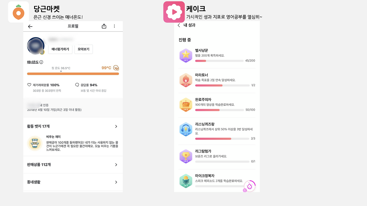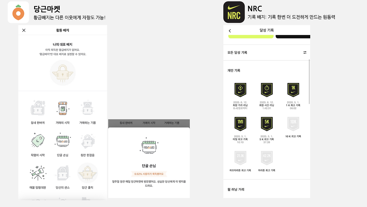 조사를 하다 보니 당근마켓, 참 게이미피케이션을 적재적소에서 잘 활용했다. 사용자가 첫 거래를 하거나, 키워드 알림 설정을 하는 등 당근마켓이 제공하는 기능을 사용할 때마다 재치 있는 이름의 뱃지를 부여한다. 당근 마켓 뱃지의 특별한 점은 전체 사용자 중 해당 뱃지를 몇% 가 획득했는지를 함께 제공해서 뱃지가 얼마나 가치 있는지를 한번 더 각인시켰다. 또, 판매글 100개 작성 등 획득하기 어려운 '황금 뱃지'는 사용자의 대표 뱃지로도 설정할 수 있어 활용 가치를 더했다.