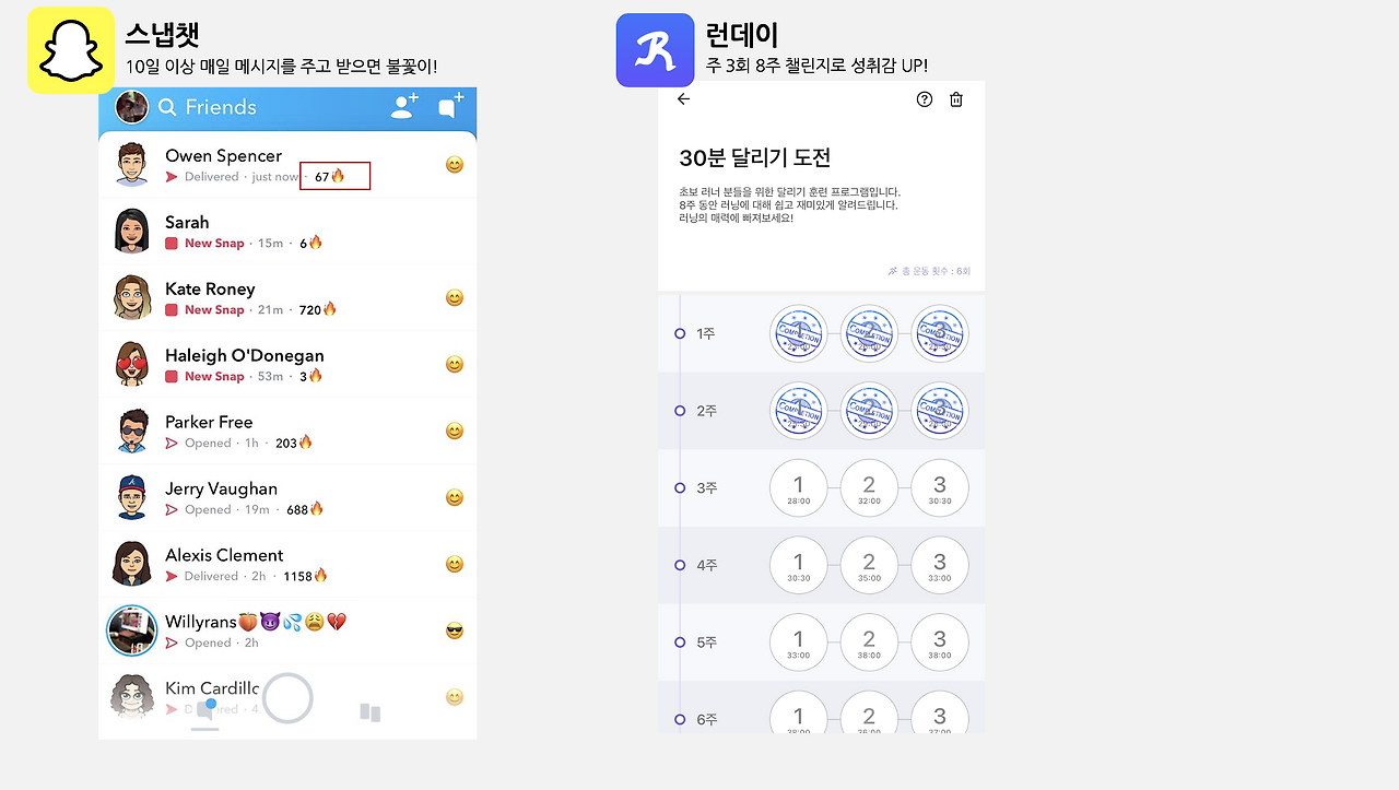 뱃지 얻기 위해 러닝 하는 사람이 있다? 러닝 어플의 쌍두마차라고 할 수 있는 NRC(Nike Running Club)과 런데이는 '뱃지 보상 시스템'을 이용해 사용자가 앱을 지속적으로 이용하도록 한다. 달린 거리에 따라, 오늘이 몇 번째 연속 달리기인지에 따라 뱃지로 보상하면서, 사용자가 좀 더 도전해볼 수 있도록 한다.