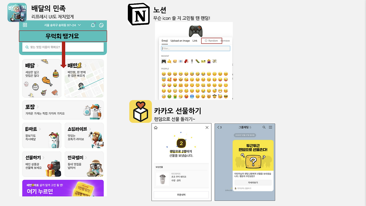 여러 서비스에서 크고 작은 형식으로 제공하는 '랜덤 요소' 역시 사용자에게 재미를 주는 포인트다. 배달의 민족은 목록 리프레시를 위해 화면을 아래로 당길 때마다 랜덤으로 배달 음식을 추천해준다. 노션은 페이지별로 아이콘을 설정할 수 있는데, 랜덤 버튼을 누르면 알아서 아이콘을 추천해준다. (그래서 필자는 노션을 쓸 때마다 어떤 아이콘이 나올지 기대가 된다.) 카카오 선물하기는 랜덤 선물 기능을 제공한다. 메시지방에서 선물을 할 때 랜덤/혹은 선착순으로 상품을 선물할 수 있다. 특히 오픈 카톡방에서 사랑받는 기능이라고.