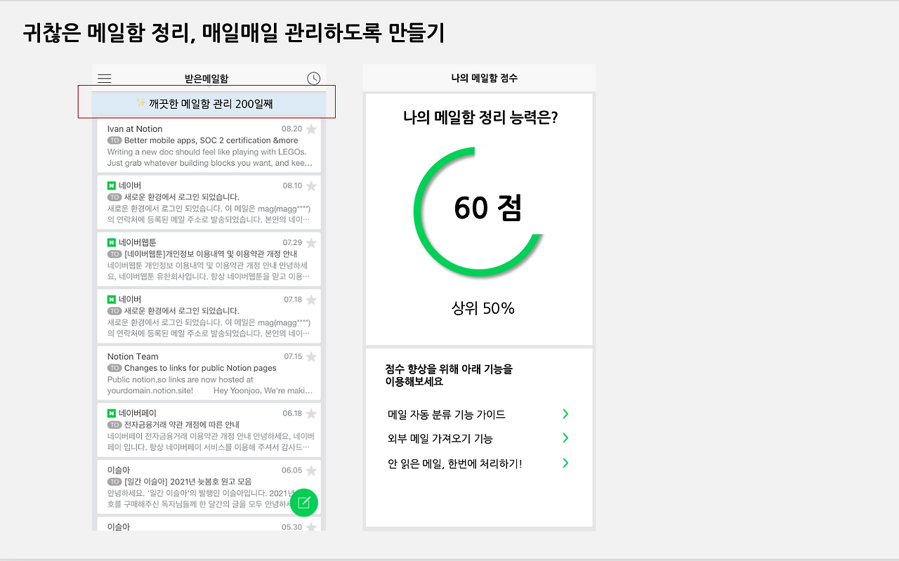 예를 들어 관리하기 귀찮은 메일함도, 매일매일 메일함을 관리하는 사용자에게 뱃지 또는 띠배너 등으로 적절한 보상을 제공하거나, 메일 관리 효율성을 점수로 평가해주는 기능이 있다면 좀 더 습관으로 이어지도록 할 수 있을 것 같다.