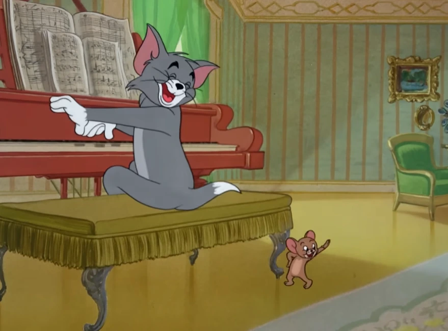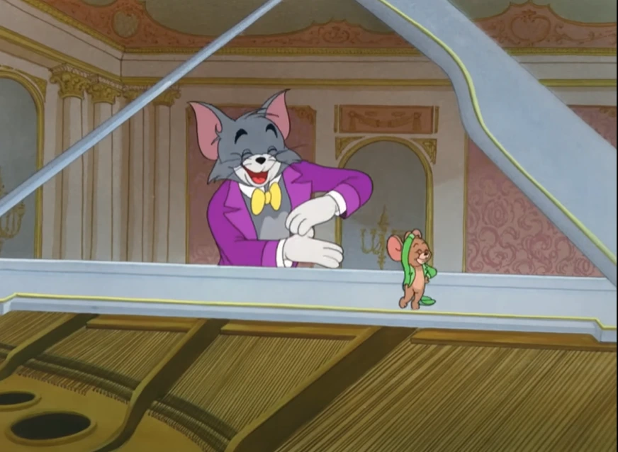 한 에피소드에서 톰은 발가락으로 피아노를 치면서 아름다운 선율로 제리를 꾀어낸다. 구멍 속에서 춤을 추며 등장한 제리를 낚아채 손에 쥐었는데, 톰의 피아노 연주에 감명받은 사람들이 나타나 박수를 치는 분위기에 그들은 언제 또 서로 으르렁댔었냐는 듯 실과 바늘 같은 파트너가 되어 신나게 시간을 보낸다.