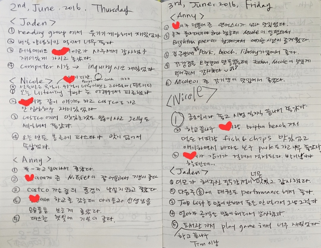 애니가 함께 하는 동안 우리의 초록색 헐크 감사노트도 훨씬 더 풍부해졌다. 애니가 한국에서 올 때 제이든 선물로 터닝메카드를, 내 생일선물로 목걸이, 귀걸이와 텀블러 등을 사 왔는데 우리 둘 다 신나 했던 기억이 고스란히 담겨있다. 오랜만에 노트를 들쳐보니 그때 기억에 미소가 지어진다.