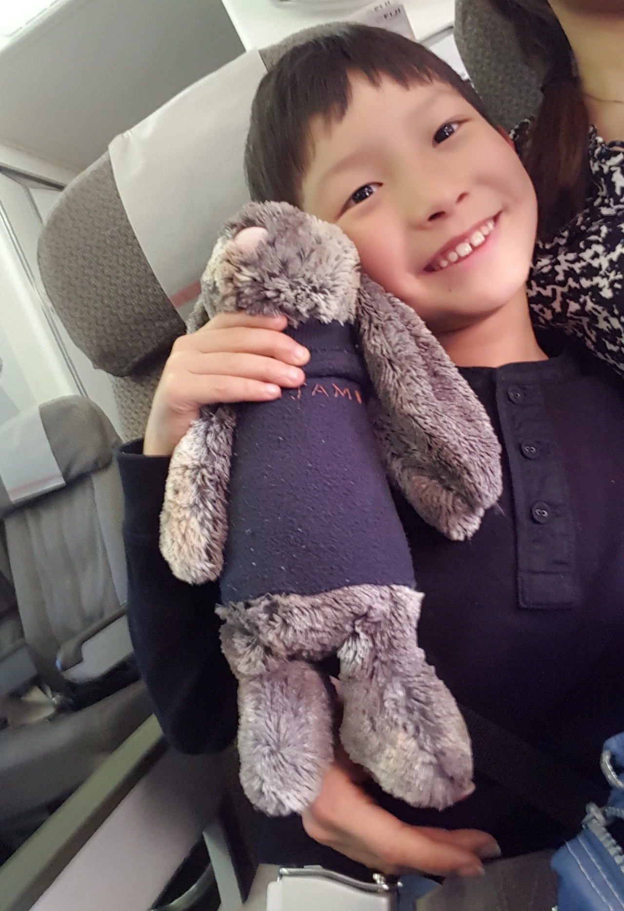 벤자민과 함께 아빠를 만나러 가는 비행기 안에서 제이든은 한없이 행복한 표정이었다. 지난번 아빠와 함께 시드니에 다녀온 3월 이후, 딱 5개월 만이었다. 이번에는 벤자민도 함께 했는데, 벤자민 옷도 스너플스처럼 우리가 만들어주고 이름도 새겨주었다.