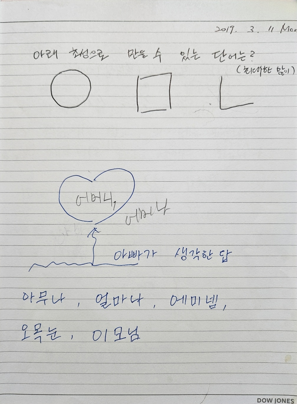 이 초성을 보고 '어머니' 외에 다른 단어를 먼저 떠올릴 사람이 있을까? 생각해 본다. 그때는 제이든의 답을 보고도 그냥 그런가 보다 했는데 지금 다시 보니 첫 번째 문제의 첫 번째 답이 '제이든의 어머니 = 바로 나'라는 생각에 갑자기 히죽 미소가 지어진다. (별 것에 다 의미를 두는 나다 ㅋㅋ)
