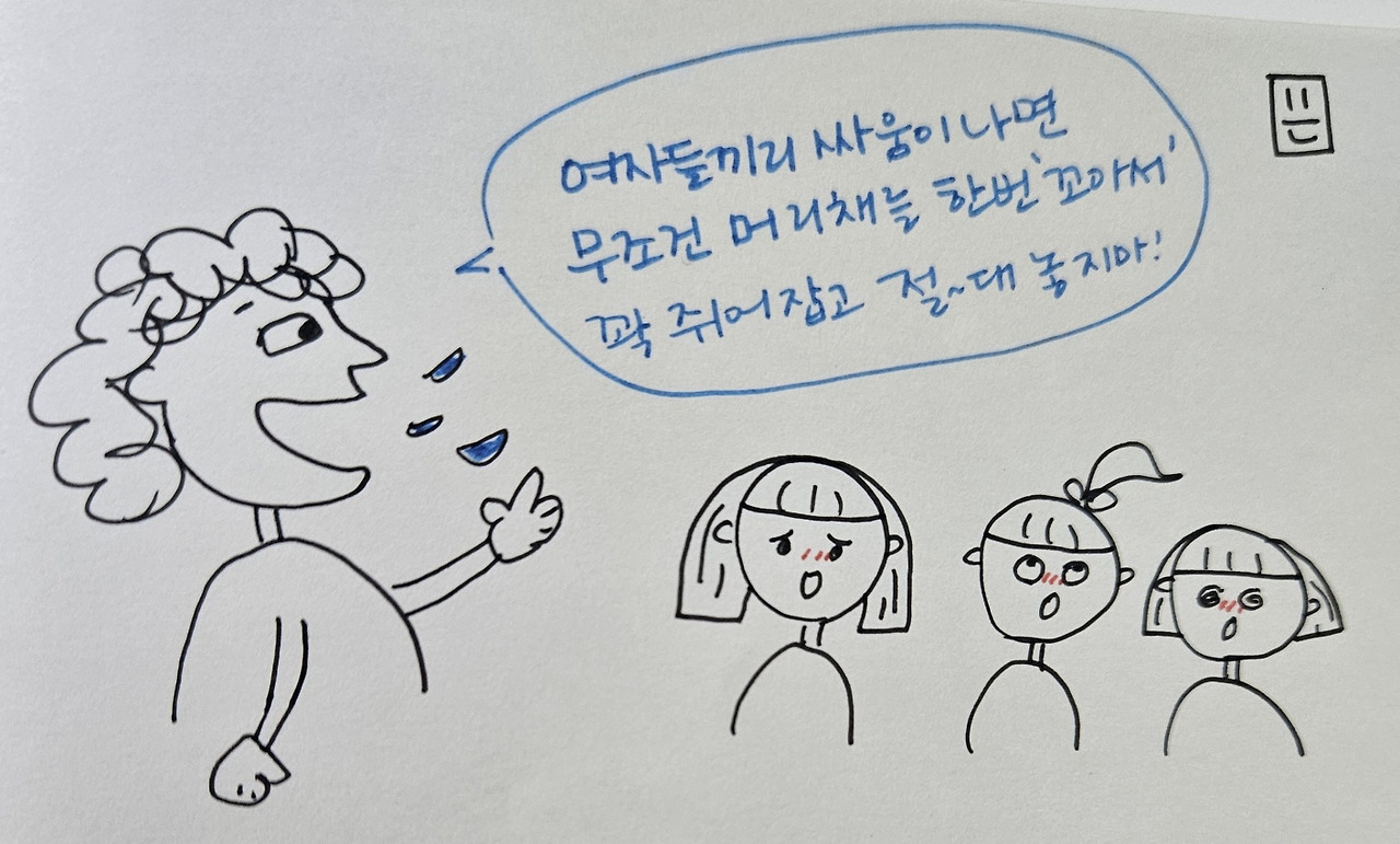 어릴 때 딸 셋을 키우던 엄마, 아빠는 여러 가지 당부 말씀이 있으셨어요. 그중에서도 특히 엄마가 전수해 주신 '여자들 간 싸움의 꿀팁'을 생각하면 지금도 웃음이 납니다. 엄마는 과연 그 기술을 써먹어본 적이 있을지... 문득 궁금해지네요. 근데 신기한 건 언니들은 이 얘기가 다들 기억이 안 난다고 합니다. 내일 엄마에게 전화해서 여쭤봐야겠어요. 하하하