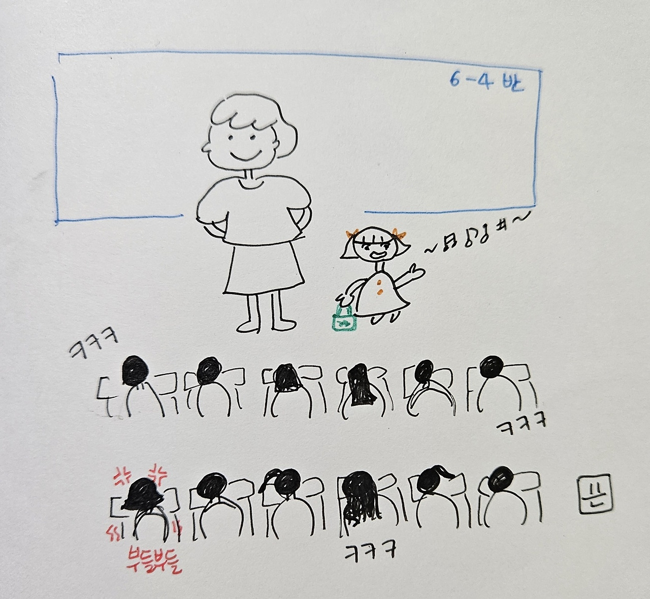 그런 저에게 공식적으로 언니를 찾아갈 수 있는 좋은 구실이 생겼어요. 엄마가 큰언니에게 (따뜻한) 도시락을 가져다주라고 한 거죠. 신이 나서 언니네 반에 앞에서 종이 치기를 기다렸어요. 그때도 영락없이 저는 뺑글뺑글 돌면서 스스로 작사작곡한 이름 모를 노래를 신나게 부르고 있었답니다.