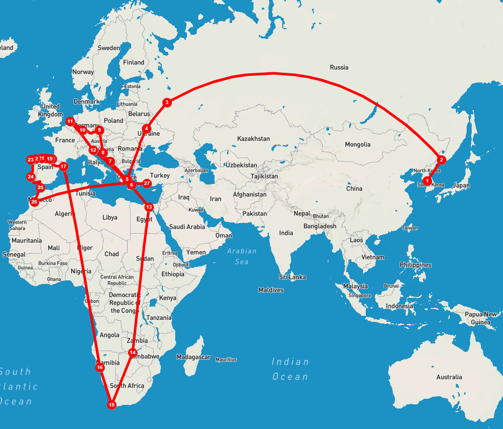 ① 한국 → ② 러시아 블라디보스톡(시베리아 횡단 열차) → ③ 러시아 모스크바 → ④ 우크라이나 키이우 → ⑤ 그리스 아테네 → ⑥ 그리스 산토리니 → 그리스 고린토스 → 알바니아 티라나 → 몬테네그로 포드코리차 → ⑦ 크로아티아 두브로브니크 → ⑧ 크로아티아 플리트비체 → 크로아티아 자그레브 → 오스트리아 비엔나 → 슬로바키아 브라티슬라바 → ⑨ 체코 프라하 → ⑩ 독일 프랑크푸르트, 하이델부르크, 본 → ⑪ 네덜란드 뒤셀도르프, 노테르담 → 벨기에 브뤼셀 → ⑫ 이탈리아 베니스 → ⑬ 이집트 카이로→ ⑭ 짐바브웨 빅토리아 폭포 + 보츠와나 국립공원 → ⑮ 남아공 케이프타운 → ⑯ 나미비아 나미브사막 → ⑰ 스페인 바르셀로나 → ⑱ ~ ㉓산티아고 순례길→ ㉔ 포르투갈 포르투, 리스본, 에리세이아, 신트라 → 라고스 → 파고 → 세비야, 론다 → ㉕ 모로코 탕헤르 → 테투안 → 쉐프샤우엔 → 페즈 → ㉖ 쉐프샤우엔 → 마라케시 → 터키 안탈리아
