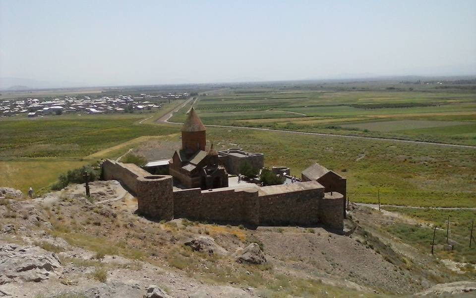 아라랏산을 마주보고 서 있는 코르 비랍의 언덕에는 수도원 교회가 세워져 있었다. 이 언덕에 올라가서 쳐다보니, 아라랏산이 사뭇 가까이 느껴진다. 아라랏산은 정상은 7월의 무더운 날씨에도 만년설이 덮여 있었다. 일기가 조금만 더 화창했으면, 훨씬 더 뚜렷하게 아라랏산을 볼 수 있었겠으나, 오늘은 안개가 낀 것처럼 세상이 다소간 뿌옇다. 그럼에도 불구하고, 아라랏산을 쳐다보는 것은 제법 설레는 일이었다. 5000미터가 넘는 높은 산인 아라랏산은 거대한 산악지역 가운데 있는 산이 아니라, 주위의 평야 지대에 우뚝 솟아오른 산이었다. 방주에서 내린 노아가 아라랏산에서 쳐다봤을 때, 산 아래로 넓게 펼쳐진 평야지대에서 희망의 싹을 봤을 거라는 생각이 들었다. 그러고 보니, 현재 그 평야 지대에 포도 농장이 가득했다.