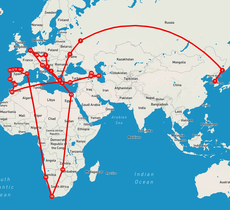 ① 한국 → ② 러시아 블라디보스톡(시베리아 횡단 열차) → ③ 러시아 모스크바 → ④ 우크라이나 키이우 → ⑤ 그리스 아테네 → ⑥ 그리스 산토리니 → 그리스 고린토스 → 알바니아 티라나 → 몬테네그로 포드코리차 → ⑦ 크로아티아 두브로브니크 → ⑧ 크로아티아 플리트비체 → 크로아티아 자그레브 → 오스트리아 비엔나 → 슬로바키아 브라티슬라바 → ⑨ 체코 프라하 → ⑩ 독일 프랑크푸르트, 하이델부르크, 본 → ⑪ 네덜란드 뒤셀도르프, 노테르담 → 벨기에 브뤼셀 → ⑫ 이탈리아 베니스 → ⑬ 이집트 카이로 → ⑭ 짐바브웨 빅토리아 폭포 + 보츠와나 국립공원 ⑮ 남아공 케이프타운⑯ 나미비아 나미브사막⑰ 스페인 바르셀로나 → ⑱ ~ ㉓산티아고 순례길 → ㉔ 포르투갈 포르투, 리스본, 에리세이아, 신트라 → 라고스 → 파고 → 세비야, 론다 ㉕ 모로코 탕헤르 → 테투안 → 쉐프샤우엔 → 페즈 → 쉐프샤우엔 → 마라케시 → ㉗터키 안탈리아 → ㉘ 아제르바이잔 바쿠 ㉙ 조지아 트빌리시 → ㉚ 아르메니아 예레반