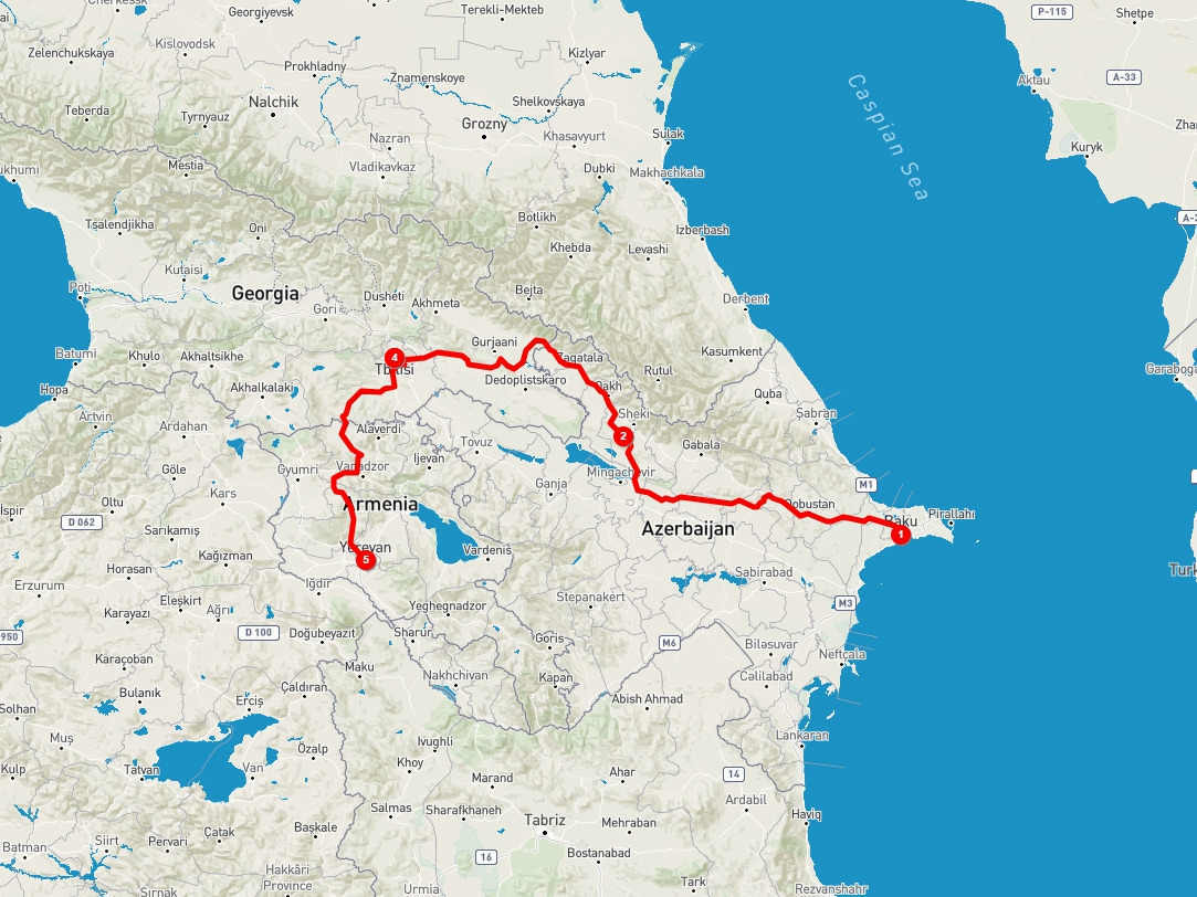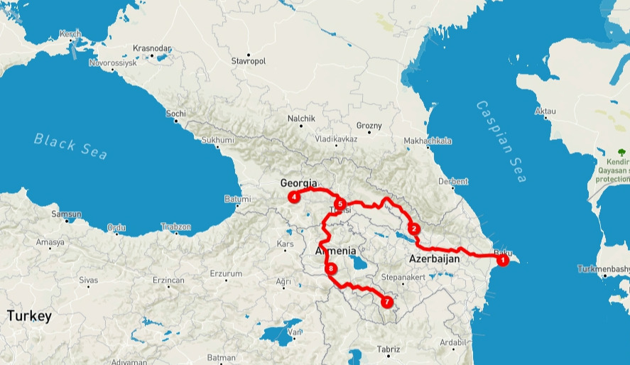 아제르바이잔: ① 바쿠 → ② 셰키 → ③ 조지아: 트빌리시 → ④ 아르메니아: 예레반