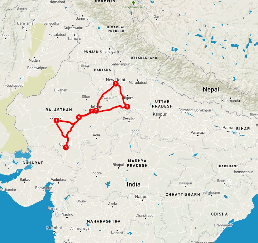 ① 델리 → ② 자이푸르 → ③ 우다이푸르 → ④ 조드푸르 → ⑤ 자이푸르, ⑥ 푸시카르. ⑦ 자이푸르 → ⑧ 아그라 → ⑨ 델리