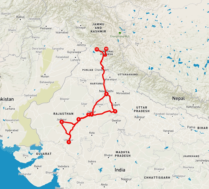 ① 델리 → ② 자이푸르 → ③ 우다이푸르 → ④ 조드푸르 → ⑤ 자이푸르, ⑥ 푸시카르. ⑦ 자이푸르 → ⑧ 아그라 → ⑨ 델리 → ⑩ 마날리 → ⑪ 다람살라 → ⑫ 델리