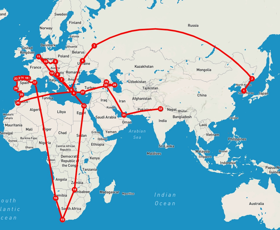 ① 한국 → ② 러시아 블라디보스톡(시베리아 횡단 열차) → ③ 러시아 모스크바 → ④ 우크라이나 키이우 → ⑤ 그리스 아테네 → ⑥ 그리스 산토리니 → 그리스 고린토스 → 알바니아 티라나 → 몬테네그로 포드코리차 → ⑦ 크로아티아 두브로브니크 → ⑧ 크로아티아 플리트비체 → 크로아티아 자그레브 → 오스트리아 비엔나 → 슬로바키아 브라티슬라바 → ⑨ 체코 프라하 → ⑩ 독일 프랑크푸르트, 하이델부르크, 본 → ⑪ 네덜란드 뒤셀도르프, 노테르담 → 벨기에 브뤼셀 → ⑫ 이탈리아 베니스 → ⑬ 이집트 카이로 → ⑭ 짐바브웨 빅토리아 폭포 + 보츠와나 국립공원 → ⑮ 남아공 케이프타운 → ⑯ 나미비아 나미브사막 → ⑰ 스페인 바르셀로나 → ⑱ ~ ㉓산티아고 순례길 → ㉔ 포르투갈 포르투, 리스본, 에리세이아, 신트라 → 라고스 → 파고 → 세비야, 론다 → ㉕ 모로코 탕헤르 → 테투안 → 쉐프샤우엔 → 페즈 → 쉐프샤우엔 → ㉖ 마라케시 → ㉗터키 안탈리아 → ㉘ 아제르바이잔 바쿠 → ㉙ 조지아 트빌리시 → ㉚ 아르메니아 예레반 → ㉛ 아랍에미리트 두바이 → ㉜ 인도 델리 → 자이푸르 → ㉝ 조드푸르 → 자이푸르(푸시카르) → ㉞ 아그라 → 델리 → ㉟ 마날리 → ㊱ 다람살라 → 델리