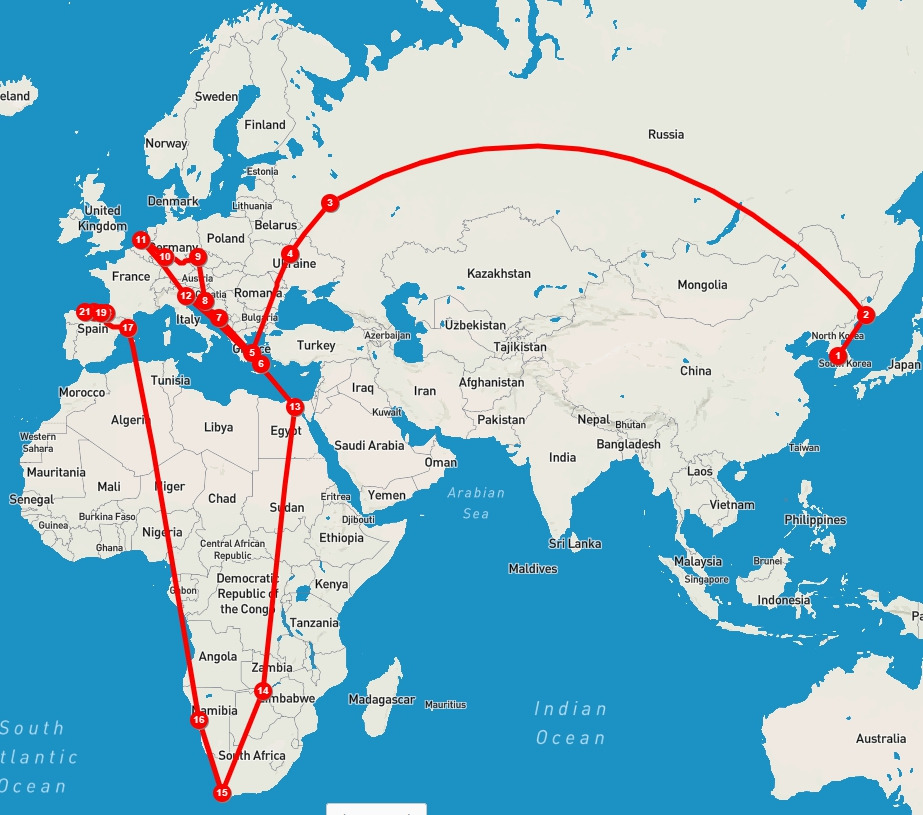 ① 한국 → ② 러시아 블라디보스톡(시베리아 횡단 열차) → ③ 러시아 모스크바 → ④ 우크라이나 키이우 → ⑤ 그리스 아테네 → ⑥ 그리스 산토리니 → 그리스 고린토스 → 알바니아 티라나 → 몬테네그로 포드코리차 → ⑦ 크로아티아 두브로브니크 → ⑧ 크로아티아 플리트비체 → 크로아티아 자그레브 → 오스트리아 비엔나 → 슬로바키아 브라티슬라바 → ⑨ 체코 프라하 → ⑩ 독일 프랑크푸르트, 하이델부르크, 본 → ⑪ 네덜란드 뒤셀도르프, 노테르담 → 벨기에 브뤼셀 → ⑫ 이탈리아 베니스 → ⑬ 이집트 카이로→ ⑭ 짐바브웨 빅토리아 폭포 + 보츠와나 국립공원 → ⑮ 남아공 케이프타운 → ⑯ 나미비아 나미브사막 → ⑰ 스페인 바르셀로나 → ⑱ 산티아고 순례길