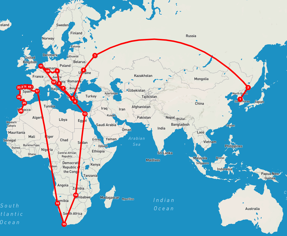 ① 한국 → ② 러시아 블라디보스톡(시베리아 횡단 열차) → ③ 러시아 모스크바 → ④ 우크라이나 키이우 → ⑤ 그리스 아테네 → ⑥ 그리스 산토리니 → 그리스 고린토스 → 알바니아 티라나 → 몬테네그로 포드코리차 → ⑦ 크로아티아 두브로브니크 → ⑧ 크로아티아 플리트비체 → 크로아티아 자그레브 → 오스트리아 비엔나 → 슬로바키아 브라티슬라바 → ⑨ 체코 프라하 → ⑩ 독일 프랑크푸르트, 하이델부르크, 본 → ⑪ 네덜란드 뒤셀도르프, 노테르담 → 벨기에 브뤼셀 → ⑫ 이탈리아 베니스 → ⑬ 이집트 카이로→ ⑭ 짐바브웨 빅토리아 폭포 + 보츠와나 국립공원 → ⑮ 남아공 케이프타운 → ⑯ 나미비아 나미브사막 → ⑰ 스페인 바르셀로나 → ⑱ ~ ㉓산티아고 순례길→ ㉔ 포르투갈 포르투, 리스본, 에리세이아, 신트라 → 라고스 → 파고 → 세비야, 론다 → ㉕ 모로코 탕헤르 → 텐투안 → 쉐프샤우엔 → 페즈