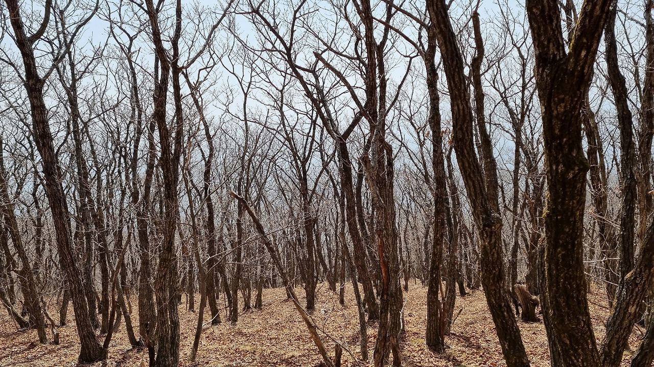 오른쪽으로 주차장까지 나오는 길은 햇빛이 넘친다. 바위도 이끼도 볼 수 없다. 물푸레나무와 참나무가 액자 속 그림 같다. 바스락바스락 나뭇잎을 밟으며, 미끌미끌 햇빛을 밟으며 걷는다. 솜이불같은 낙옆 속에서 후다닥 봄이 나올거 같다. 햇빛, 낙엽, 참나무의 놀라운 삼위일체다.