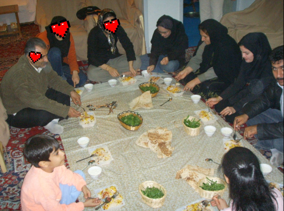 그녀를 따라가며 토막말 하는 사이 집에 도착했다. 현관 불이 환하게 켜지고, 그제야 그녀가 눈이 깊고 아름답다고 생각했다. 마샤의 어머니가 반긴다. 아버지, 여자 동생, 7살 남자 동생이 가족이다. 마샤는 에스파한에서 대학을 다니고 그날은 집에 오는 길이었다. 아버지는 수학 교사다. 같은 교사라는 이유로 더 반가웠다. 불쑥 나타난 작은 동양 여자로 인해 그들의 새벽은 부산했다. 이란-영어 사전을 보며 대화했다. 지금 같으면 번역기가 있으니 수월했을 텐데 2007년의 내 휴대폰은 스마트 폰이 아니었다. 남자아이가 옆에서 연신 손짓 발 짓을 한다. 태권도란다. KBS-WORLD 방송을 시청해서 알고 있다고. 그러면서 채널을 돌린다. 이곳에서 한국 방송을 볼 줄이야. 꼬마의 환영 태권도에 뭉클했다. 평소 애국자도 아닌데 떠나면 애국자라더니. 꼬마가 계속 태권도를 하는 바람에 다소 어색한 시간을 웃으며 보낼 수 있었다. 바닥에 식탁보를 깔고 빙 둘러앉아 식사했다. 흰쌀밥이다. 쌀밥과 이름 모를 반찬으로 양껏 먹었다. 여행자의 뜨거운 아침 식사다.