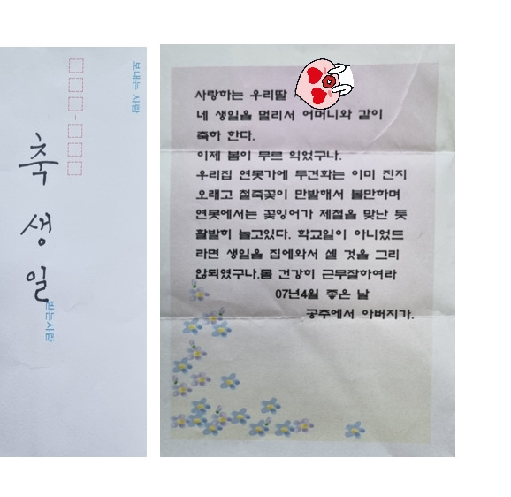 연도 별로 줄 세우니 83년 5월 편지가 제일 먼저다. 봉투 겉면 글씨를 한 참 바라보다 천천히 열었다. 40년 만에 다시 읽는다. 따뜻한 아버지 필체, 방금 받은 편지나 다름없다. 읽을수록 목에 얹히는 그리움, 찬물에 풍덩 밥이라도 말아먹어야 내려갈 거 같다. 내용은 생일날 집에서 찍은 사진을 동봉한다는 것과 근무 열심히 하라는 글이다. 사진은 봉투 안에 없었지만 분명 활짝 핀 철쭉 앞에서 찍은 사진 일게다. 사진 촬영을 좋아하셔서 내려갈 때마다 찍어주셨다. 그래서인지 집에서 특히 철쭉꽃 앞에서 찍은 옛 사진이 많다. 난 받기만 했지 생신 때 편지 쓴 기억이 없다. 선물만 날름 드렸을 뿐. 만일 내게 자식이 있었다면 생일 편지를 보냈을까?