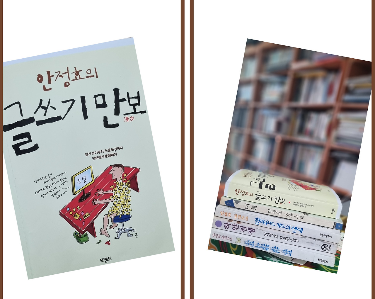 많은 작법서 중 선택의 문제에 고민했다. 첫 번째, 목차를 봤다. 두 번째는 쪽수를 보고 다음으로 작가를 생각했다. 목차를 봤을 때 가장 기초적인 글쓰기부터 시작하여 작가로서의 마음가짐까지 세분화하여 쓴 책이 「글쓰기 만보」였다. 그런데 쪽수가 오백 쪽이 넘는 가장 두터운 책이라 살짝 고민했다. 하지만 글쓰기 초보자에게 적합했다. 유명한 스티브 킹의「글쓰기의 유혹」은 1/3 정도 읽었는데 작법에 관한 내용이 안 나와 포기했다. 「강원국의 글쓰기」도 기초부터 요약 형식으로 기획하여 읽기 좋게 편집됐다. 강원국과 안정효 작가 중 안정효를 선택했다. 안정효 작가는 90년대 많이 좋아했던 작가다. 그때 「은마는 오지 않는다」,「미늘」, 「헐리우드 키드의 생애」, 「하얀 전쟁」을 읽으며 다음 편 나오길 기다리는 행복한 순간도 있었다. 그만큼 책이 재미있었다. 나의 안정효 소설 읽기는 거기서 끝났고, 30여 년 만에 소설이 아닌 작법서로 다시 만났다.