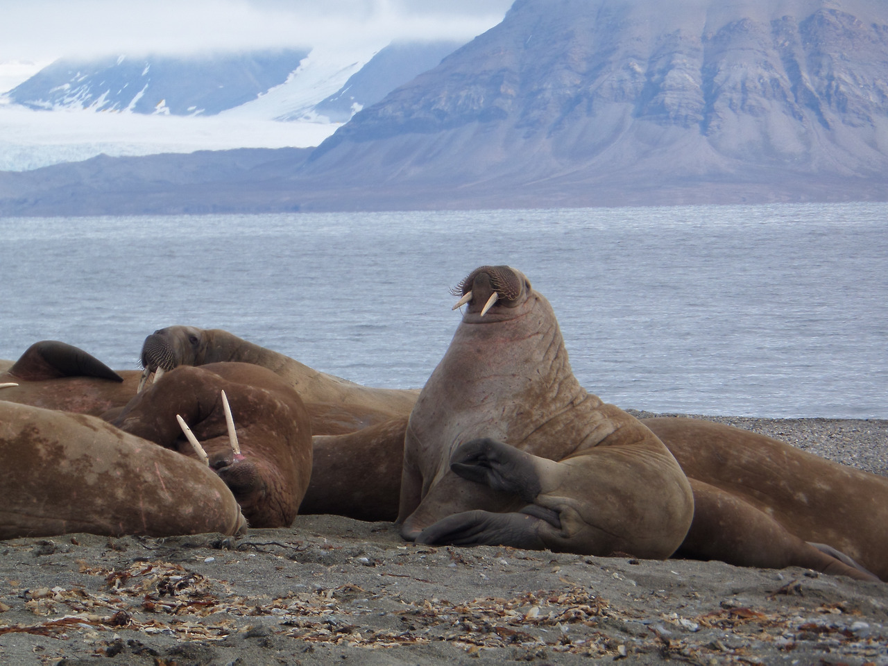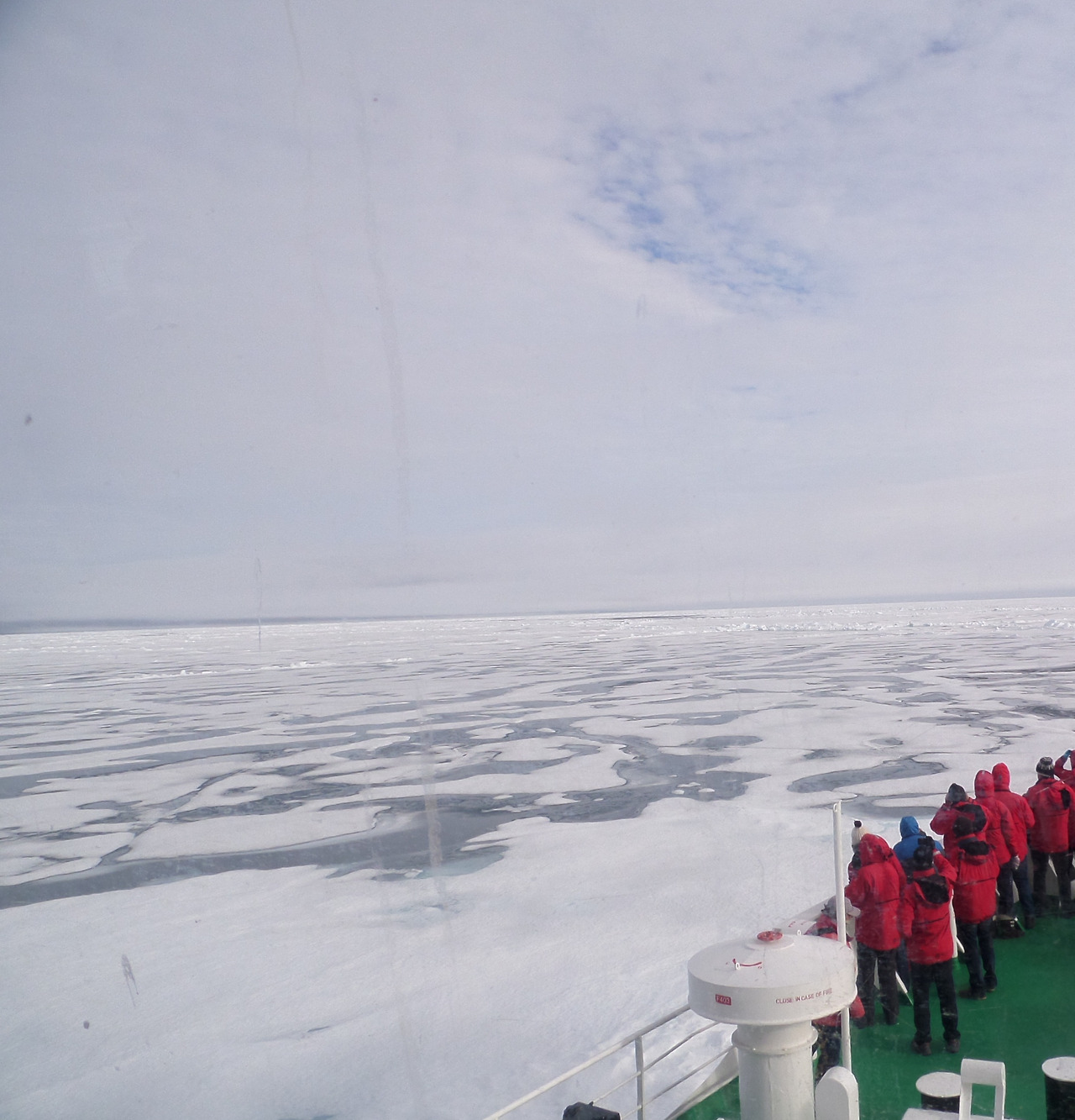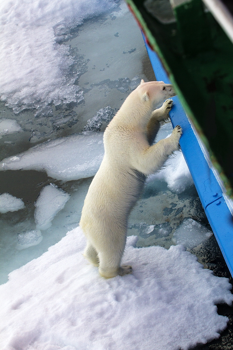 배는 계속 북쪽으로 올라갔다. 유빙이 많아지며 급기야는 바다가 하얗다. 바다가 얼음과 눈으로 뒤덮였다. 갑자기 사람들이 웅성거린다. 북극곰이 보인다는 선내 방송이 나왔다. 배 앞쪽에 있는 조정실로 뛰어 들어갔다. 배가 멈췄다. 바다가 언 해빙 위 먼 곳에서 곰이 점같이 보이더니 점점 배 쪽으로 왔다. 모든 승객이 갑판으로 나왔다. 배에서 나는 음식 냄새를 맡고 온다고 한다. 하얀 해빙 위를 하얀 북극곰 한 마리가 배로 다가오는 모습은 영화 같았다. 물웅덩이는 헤엄치고, 해빙이 갈라진 곳은 건너뛰며 배까지 왔다. 앞발을 선박에 대고 두 발로 선 채 올려다본다. 마음 같아서는 음식물이라도 던져주고 싶었지만, 이런 행위야말로 철저히 금지하고 있다. 한동안 우리를 바라보던 곰은 해빙 위에 누워 등을 비비며 재롱을 부렸다. 북극곰 목욕이다. 북극곰은 그렇게 우리를 위해 재롱을 부리다 등 돌려 멀어져 갔다.