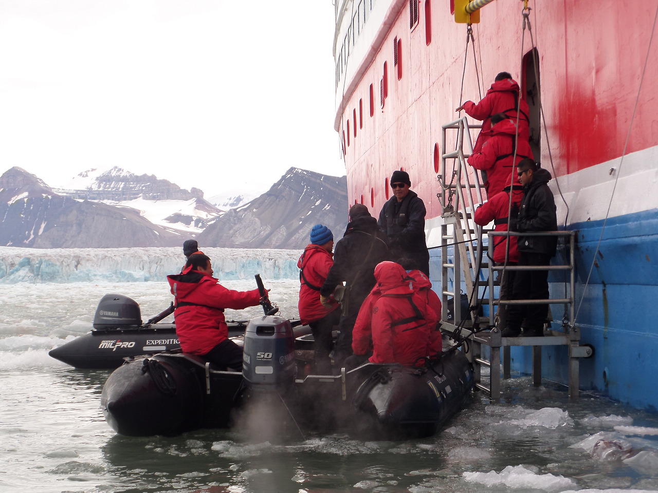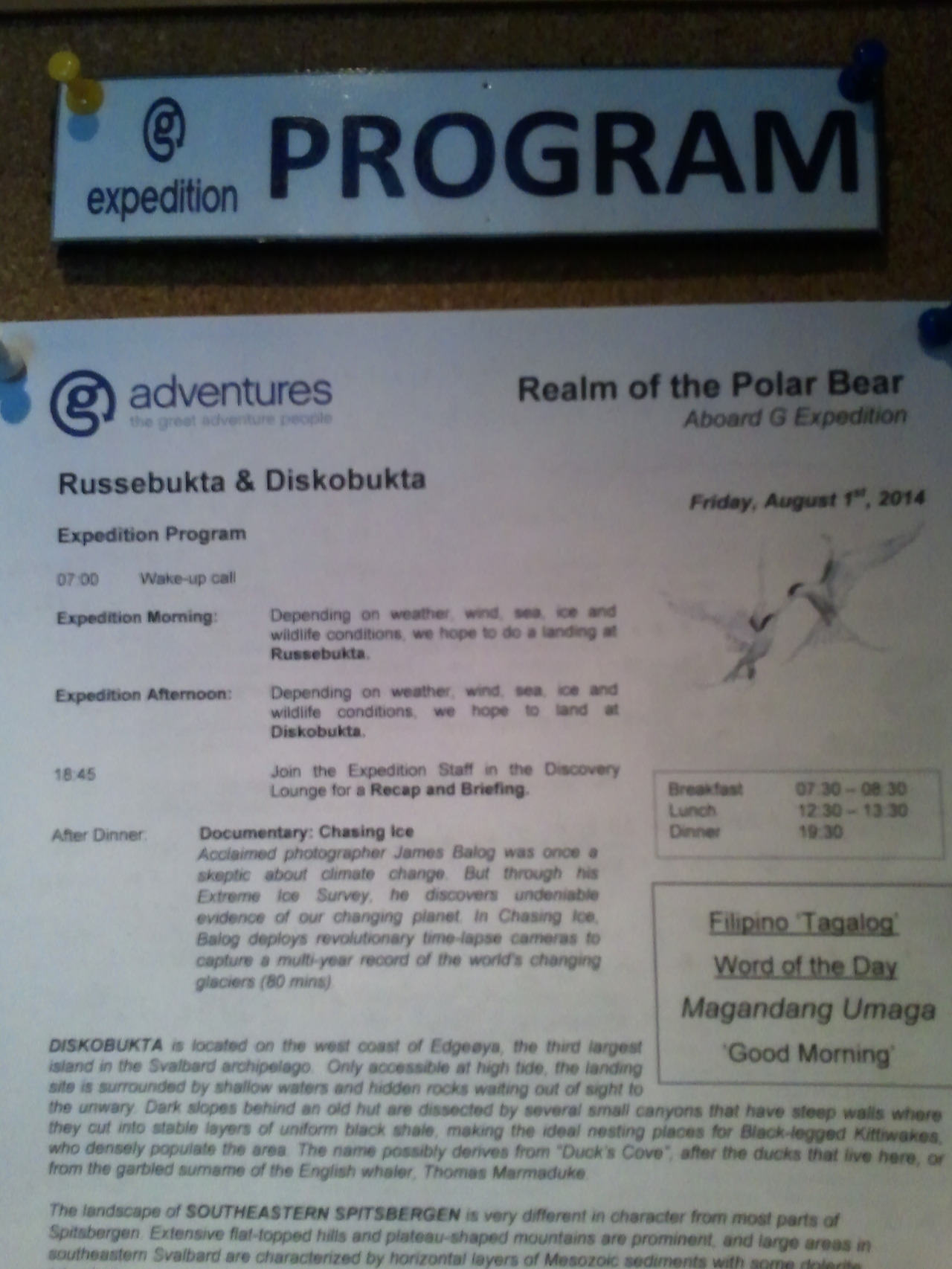 첫날은 크루즈에서 랜딩 할 때 필요한 장화와 방한 점퍼를 받았다. 장화는 배에서 나갈 때, 귀선 할 때마다 소독했다. 인원 파악을 위해 승하선 시에는 카드를 단말기에 찍어야 했다. 구명조끼, 조디악 타는 법 등 안전 규칙 교육은 지루할 만큼 철저했다. 둘째 날부터 오전 오후에 한 번씩 랜딩 하도록 프로그램이 짜여있다. 저녁에는 영상으로 북극 지역에 사는 동물 새 식물 등에 대한 교육이 있다.