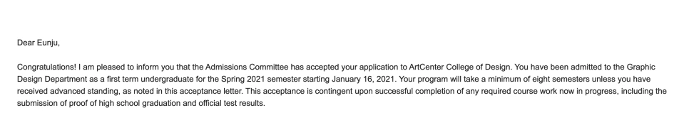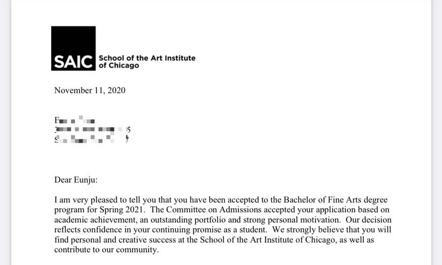 이렇게 6 학교를 지원했고 모두 다 합격이라는 감사한 결과를 받았다. 나의 1년 동안의 여정이 헛수고는 아니었다는 생각과 함께 정말 뿌듯했다. 만약 한 학교를 더 지원할 수 있다면 나는 SCAD를 지원했을 것이고 아마 아트센터와 엄청 고민을 했었을 것 같다. 다음 글에는 이 이유와 왜 아트센터를 선택했는지에 대해 더 자세히 서술해보고자 한다.