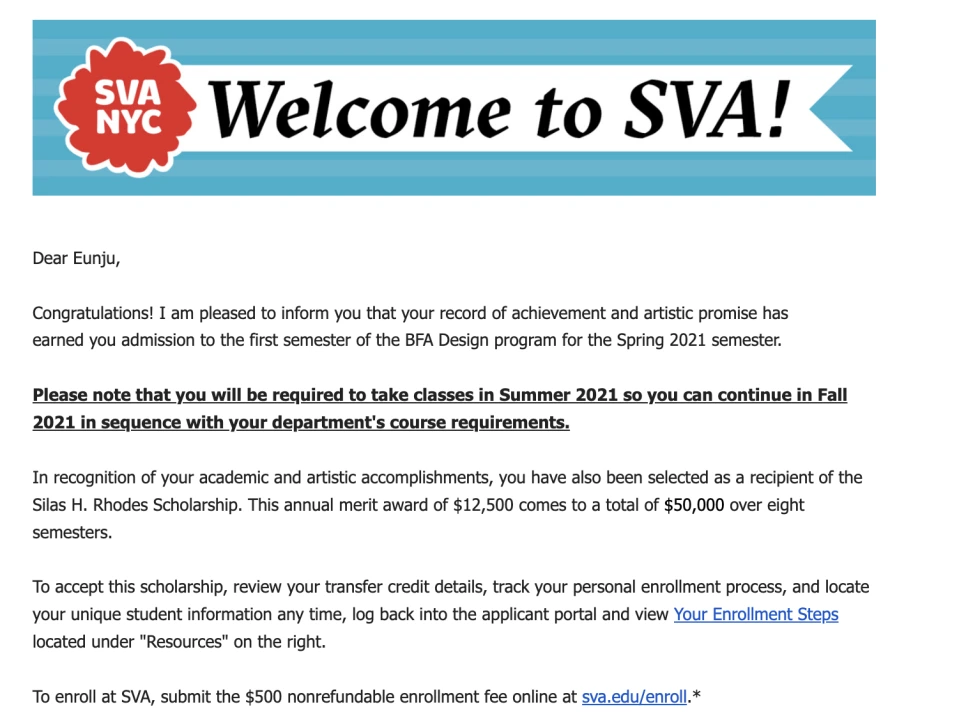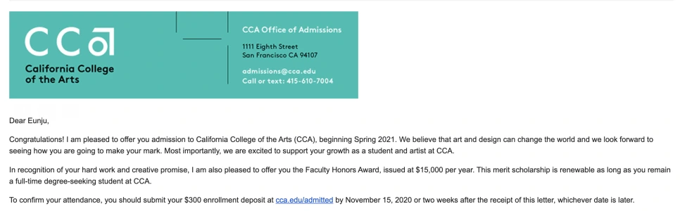 CCA도 마찬가지로 장학금 6만 불을 해주었으나 학점에 대한 통지를 받진 못했다. 아마 디파짓을 낸다면 알려주는 것 같다. CCA는 내가 살던 캘리포니아에 있던 학교라 고민을 했으나... 역시나 취업이 강한 학교를 가고 싶었고 네임 벨류가 아트센터가 더 높다고 생각이 들었기 때문에 포기했다.