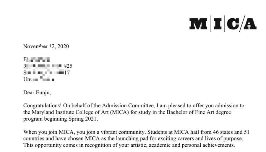 MICA는 좋은 학교였지만 지리적 위치가 가장 감점 요인이었다. 이미 같은 캘리포니아에 마음이 기운 상태였고 결과가 다른 학교에 비해 늦게 나왔어서 고민을 딱히 하진 않았다. 하지만 굉장히 친절한 학교였다.