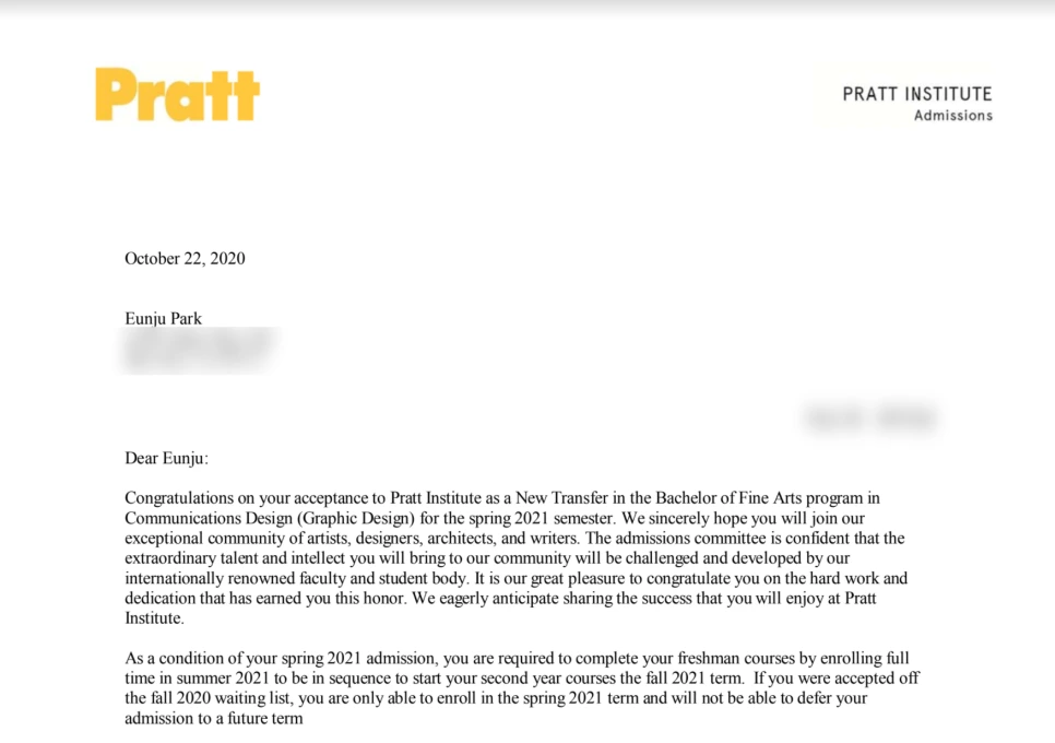 SVA 같은 경우는 1 지망 학교였고 장학금도 꽤 받고 학점 이수도 40학점이나 받았다. 그럼에도 불구하고 뉴욕이라는 지리적 거리(난 캘리포니아 거주) 그리고 2학년이 아닌 1학년 때부터 시작해야 한다는 제안 때문에 고민하다 거절했다.