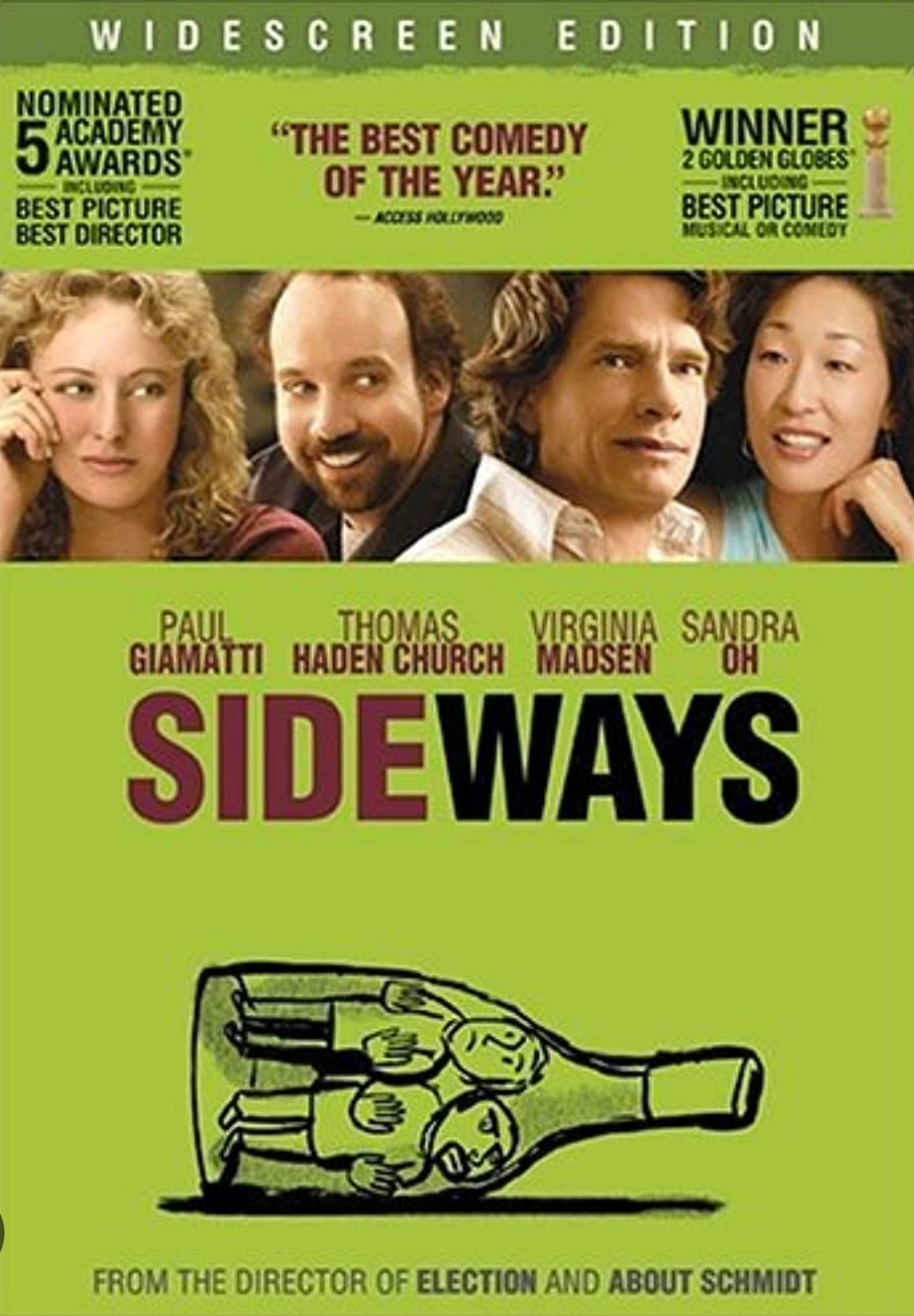 사이드웨이는 뭐든 잘 풀리는 직진인생이 아닌, 인생의 굴곡진 어느 때에 게처럼 옆으로 가는 모습을 표현한 제목인 듯하다. 물론 포스터에서 보듯이 와인을 옆으로 눕혀 보관하는 모습을 뜻한다고도 한다. 옆으로 누워있는 와인병 안에 갇혀있는 마일즈와 잭의 답답한 인생을 표현하는 그림도 재미있다.
