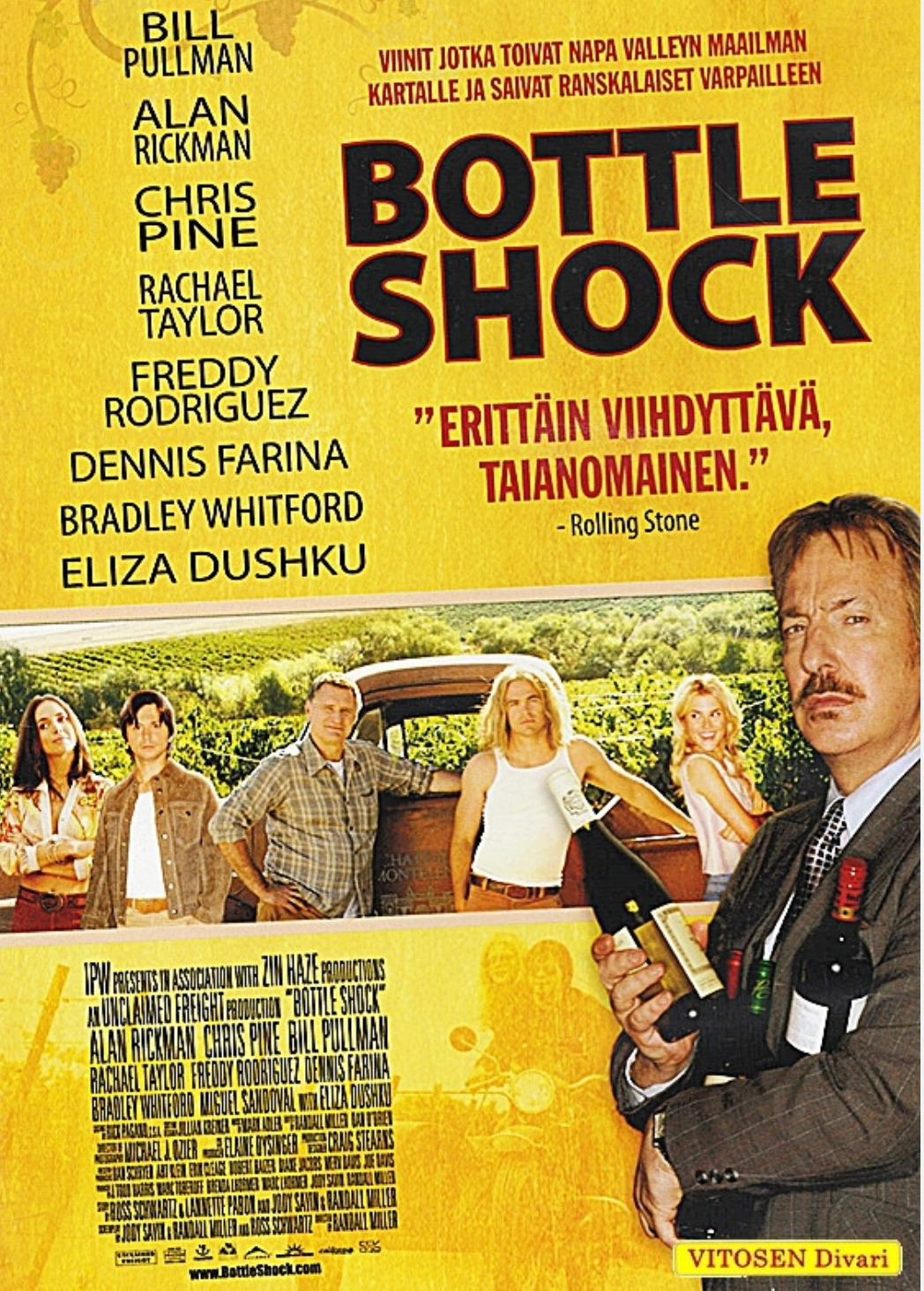 바틀 샥 ( Bottle Shock) 은 앞서 소개한 파리의 심판을 다룬 영화이다. 특별히 샤토 몬탈레이나 ( Chateau Montelena) 와이너리에서 화이트와인을 우여곡절 끝에 만들어내어 파리 블라인드 테이스팅에 출품하여 화이트 부분 1위를 먹는 드라마틱한 스토리이다. 사실과 다른 부분이 있어서 품평회 주최자였던 스티븐 스퍼리어가 영화사를 고소하겠다고 했다고 하는데, 그래서 어디서부터 어디까지가 진실인지 모르겠다. 다만 '파리의 심판' 스토리는 진실이니 거기까지만 믿는 걸로.
