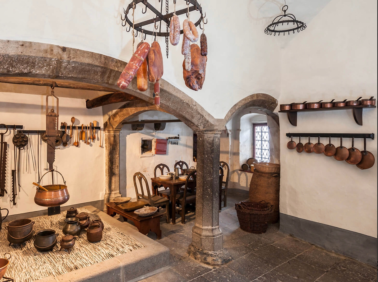 가이드를 통해 들은 이야기로는 사진처럼 주방에 음식을 천장에 매달아 놓았던 이유가 쥐들을 피하기 위해서였다고 한다. 주방에서 빵 굽던 화덕이며 주렁주렁 음식과 고기를 매달아 놓던 것을 재현해 놓았던 모습이 인상적이었다.