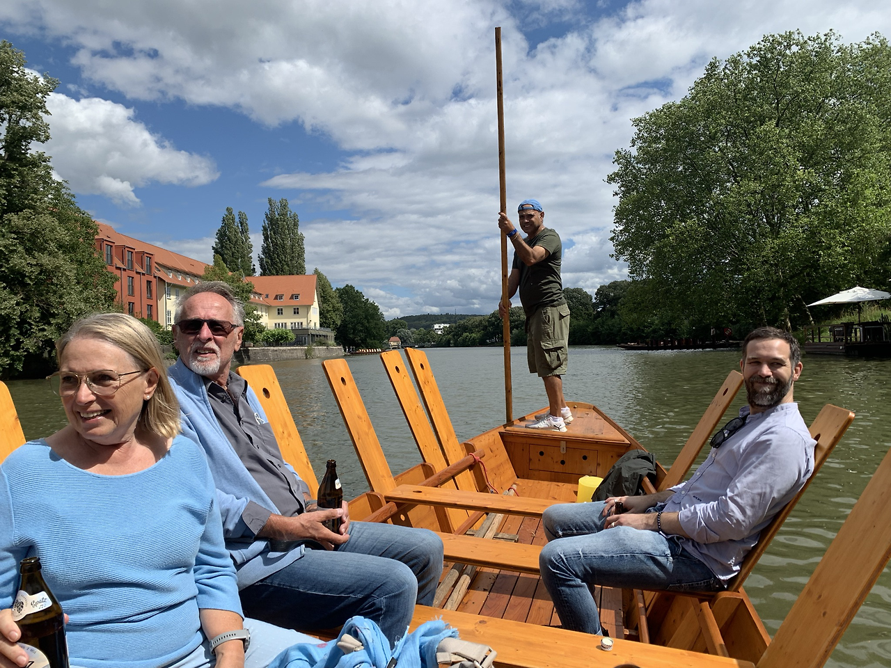 곳에서 행해지는 뱃놀이인 모양이다. 마치 베니스의 곤돌라처럼 한 뱃사공이 배의 뒤편에 서서 배를 움직인다. 그런데 곤돌라에 비해 이 배는 많은 사람을 태울 수 있다. 우리는 단 5 명이라 배가 한적하고 좋았지만 결혼식 피로연으로 배 관광을 하는 보트들은 약 15 명 정도의 사람들이 타고 있었다. 저 많은 사람을 태운 뱃사공은 엄청 힘들어 보인다. 배에 승선하기 전에 예약을 확인하는 곳에서 모두 맥주 한 병씩 가지고 타라고 한다. 그래서 우린 일인당 한 병씩 사서 배에 올랐다. 맥주를 좋아하는 독일인답다. 강을 따라 올라가다 보면 강가에 줄지어 서있는 건물들의 모습이 하늘과 나무를 배경으로 멋진 전망을 선사한다. 강 중앙에 공원처럼 조성된 숲의 푸르름은 눈뿐만 아니라 마음도 시원하게 정화시켜주는 듯하다.