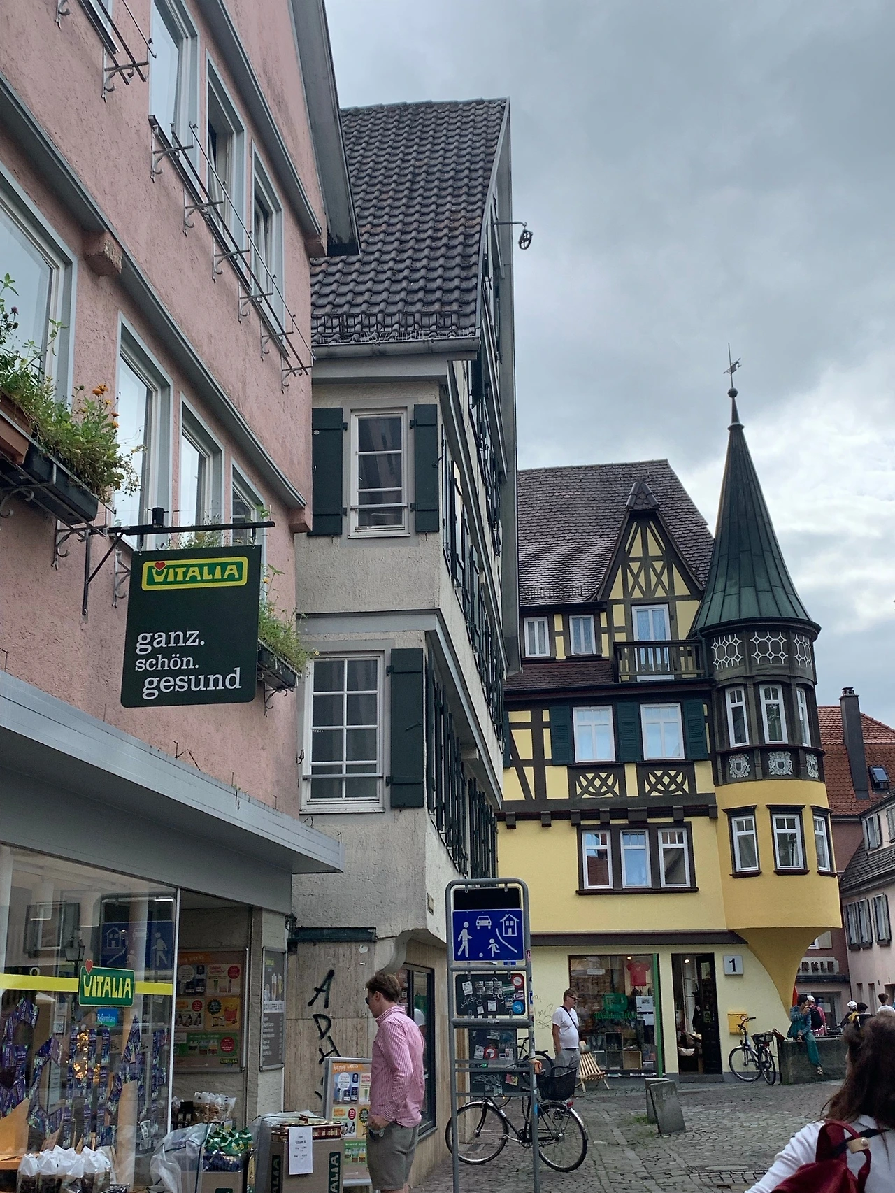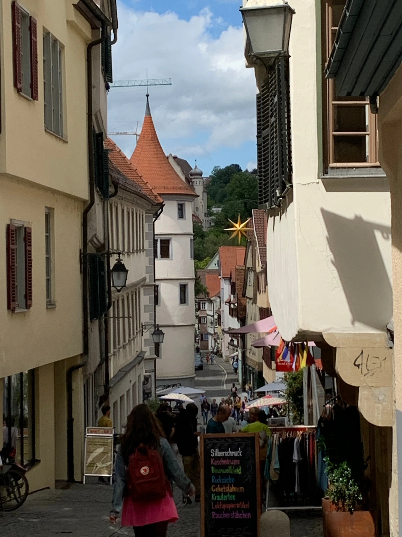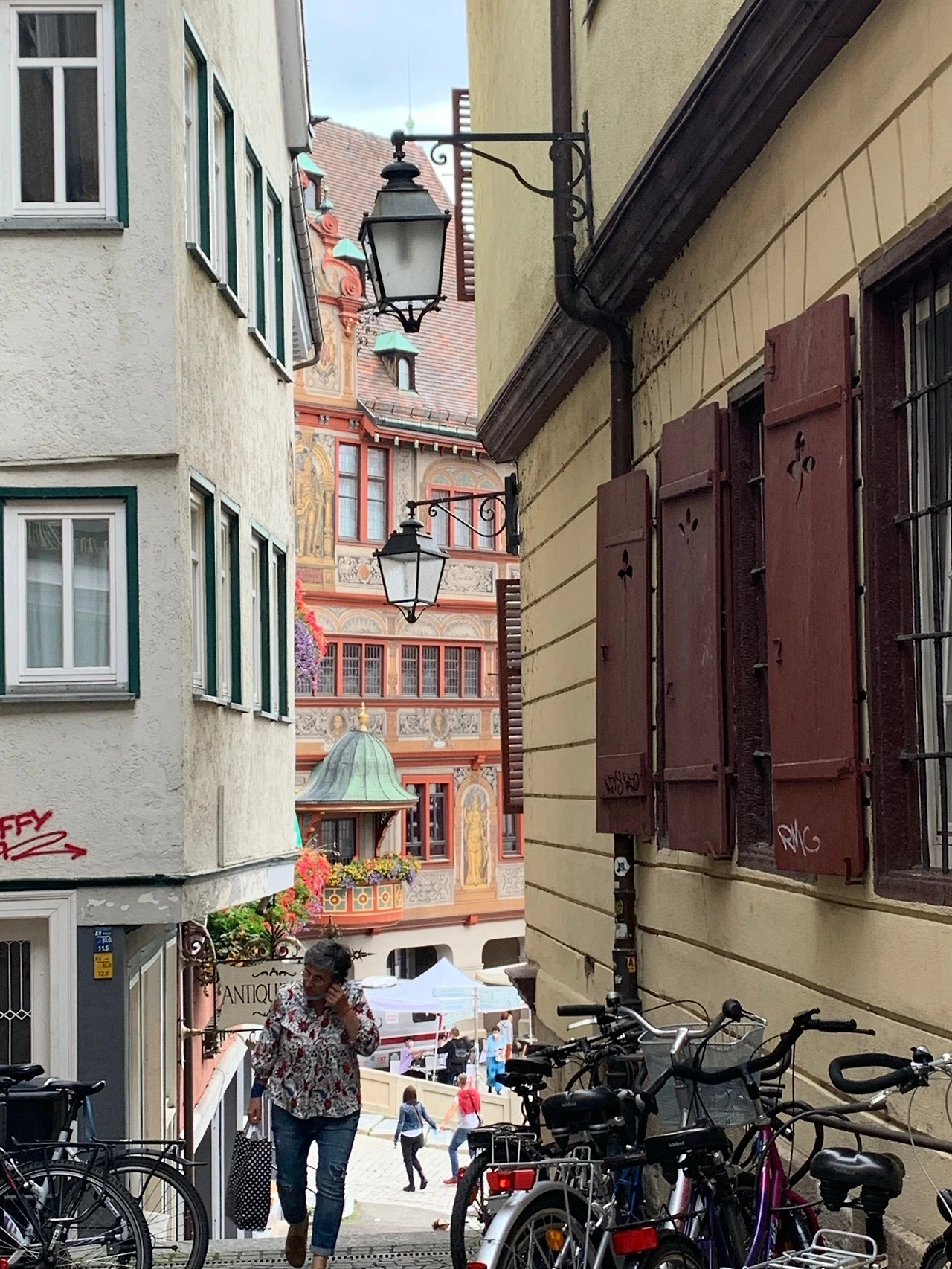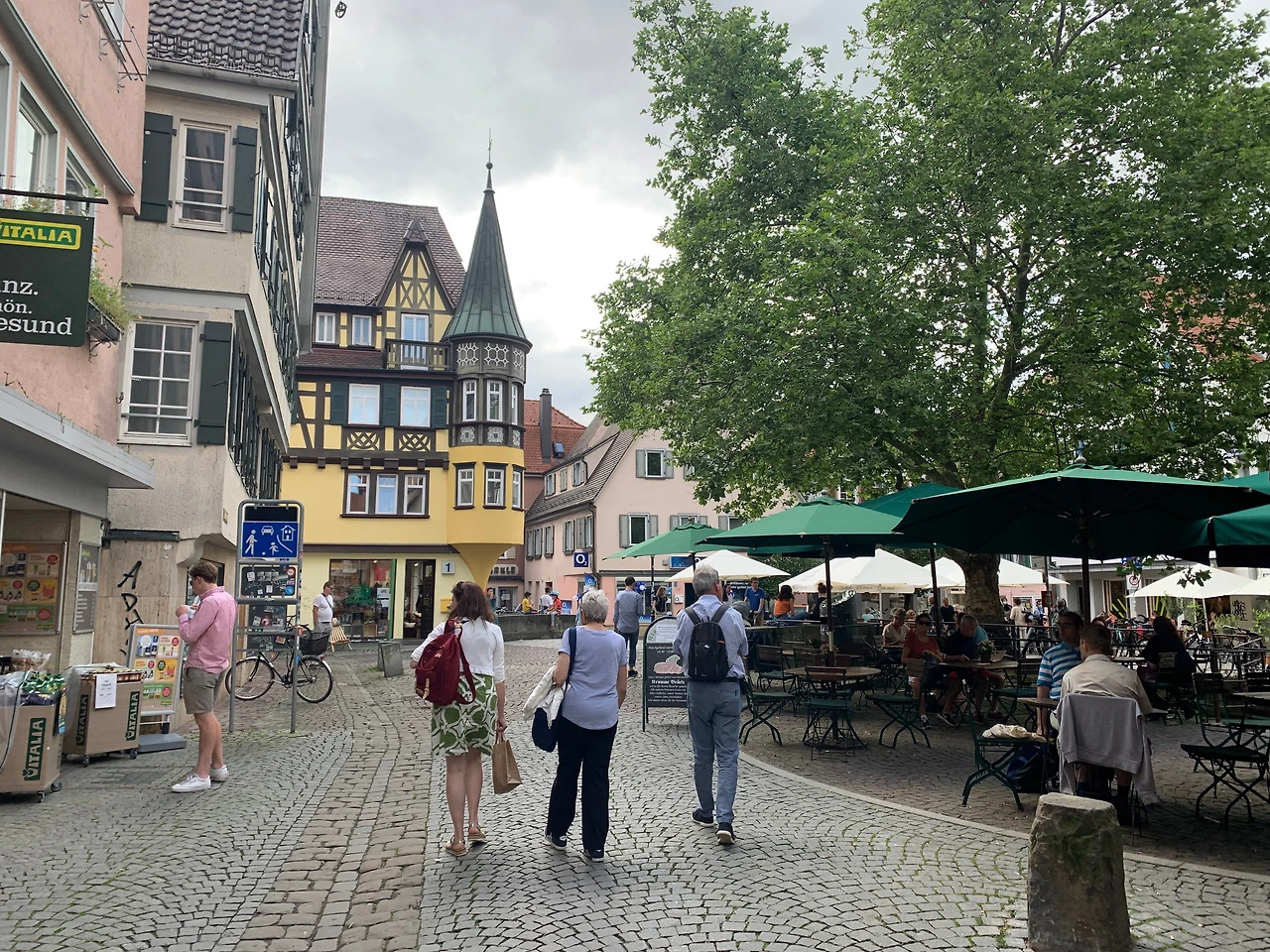수없이 퍼져있는 작은 골목길들, 중세로부터 내려오는 돌바닥과 돌계단들, 골목골목 숨어있는 카페와 레스토랑, 즐비하게 늘어선 독일의 전통적인 건물들. 펀팅이 끝나고 구석구석까지 아기자기하고 예쁜 이 중세 타운을 탐험했다. 커피숍, 작은 상점, 음식점들이 모두 중세 분위기에 녹아들어 있다. 길가에 펼쳐진 마켓에서는 식자재와 꽃들을 팔고 있고, 파라솔 아래 예쁜 탁자에는 젊은이들로 가득하다. 튜빙엔은 이 지방에서 하이델베르크 다음으로 큰 대학타운이다. 이 도시에 대학교가 있는 것이 아니라 이 도시 자체가 대학이라는 말이 있을 정도로 활기차고 젊은 도시이다. 그러면서도 오랜 세월이 숨 쉬는 느낌을 주는 도시이다. 건물들은 중세 이전부터 약 200 년 전까지 지어진 건물들이 대부분인데 그중에서도 마켓 광장에 위치한 시청이 눈에 확 띈다. 청동색 지붕의 작고 뾰족한 탑들과 화려하고 정교한 외부벽이 매우 독특하다. 1400 년대에 처음 지어졌다는데 한번 보면 못 잊을 것 같이 특이하고 아름다운 건물이다.