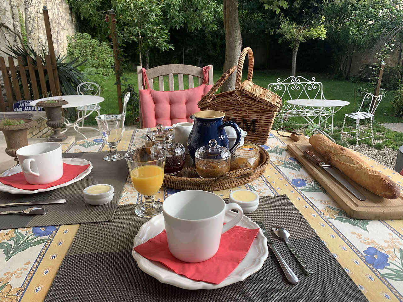 다음 날 아침, 식사를 하러 아래층으로 내려간 나는 빵 맛에 앞서 테이블 세팅 비주얼에 넋을 잃었다. 날이 좋아 야외에 차렸다는 테이블은 그들의 집 뒷마당 모퉁이에 벽돌 벽 옆에 파라솔 아래 차려져 있었다. 가꾼 듯, 안 가꾼 듯 자연스럽게 피어난 풀이며 꽃들이 하얀 철제 벤치와 앙증맞은 의자의 배경으로 그림처럼 자리 잡고 있었다. 아, 이런 건 도대체 사진이나 비디오로도 다 담기질 않는다. 그렇다고 눈에만 담자니 기억은 믿을 수가 없다. 또 이런 정원에 꼭 어울리는 알록달록한 테이블보 위에는 바게트와 크로와상, 오렌지 주스가 담긴 프랑스 시골집에 있을 법한 투박한 도자기로 된 피쳐, 커피와 수제 잼, 그리고 내가 애정 하는 프렌치 버터로 한상 그득 차려져 있다. 아~ 정말 이 정원에서의 식사는 평생 못 잊을 것 같다. 물론 바게트와 크로와상의 맛은..... 엄지척!