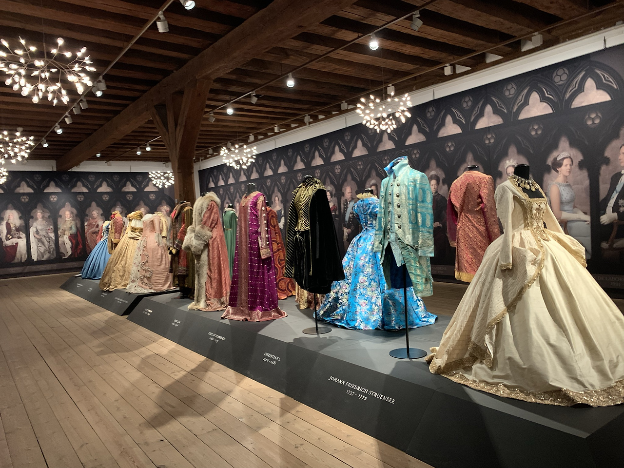 . 역대 왕과 왕비의 복식을 시대별로 전시해 놓았다. 벽에는 돌아가며 왕과 왕비의 초상화가 시대순으로 그려져 있다.