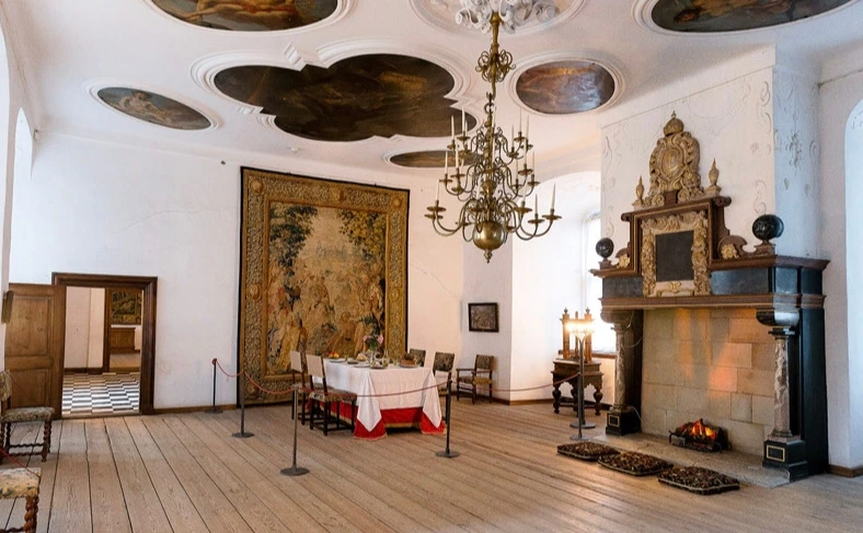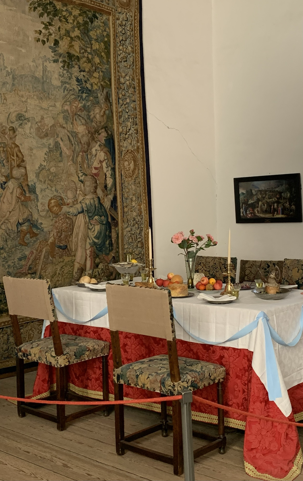 왕비의 사교모임 방. 거대 태피스트리 아래 식탁이 보이고 천장화도 특이하다.