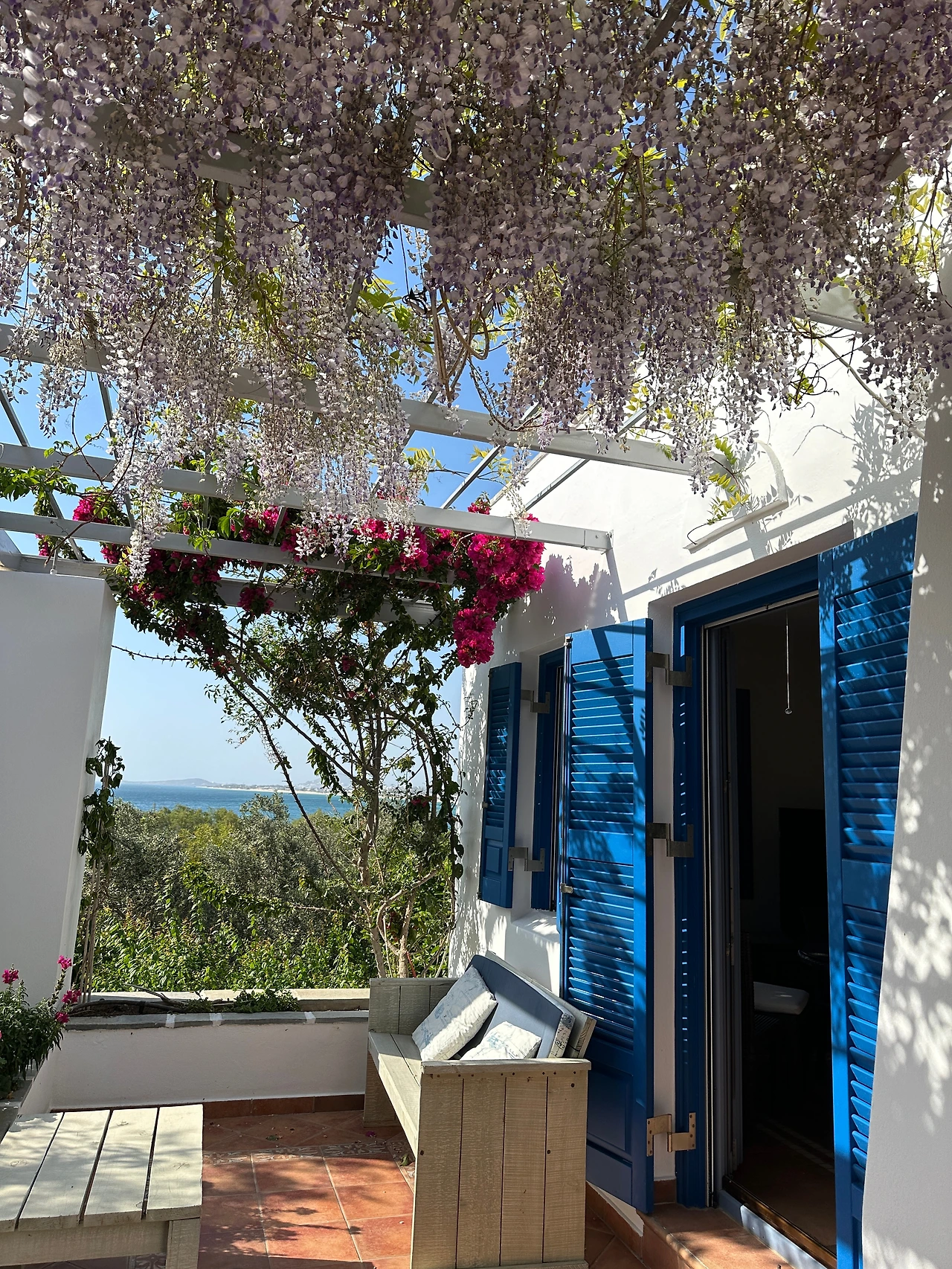 휴양을 목적으로 하는 여행이라 5일 동안 묵을 곳을 정말 좋은 리조트로 구했어요. 바다가 훤히 내려다보이는 수영장, 앞마당에 자리 잡은 작은 올리브 농장, 그리고 여러 채소와 과일이 자라는 넓은 정원까지. 야외 테이블도 잘 마련되어 있어 그저 머무는 것만으로도 힐링이 되는 그림 같은 공간이었습니다. 그냥 이곳에만 있어도 힐링이 되는 곳이라 저의 목적에 딱 맞는 곳이었죠.