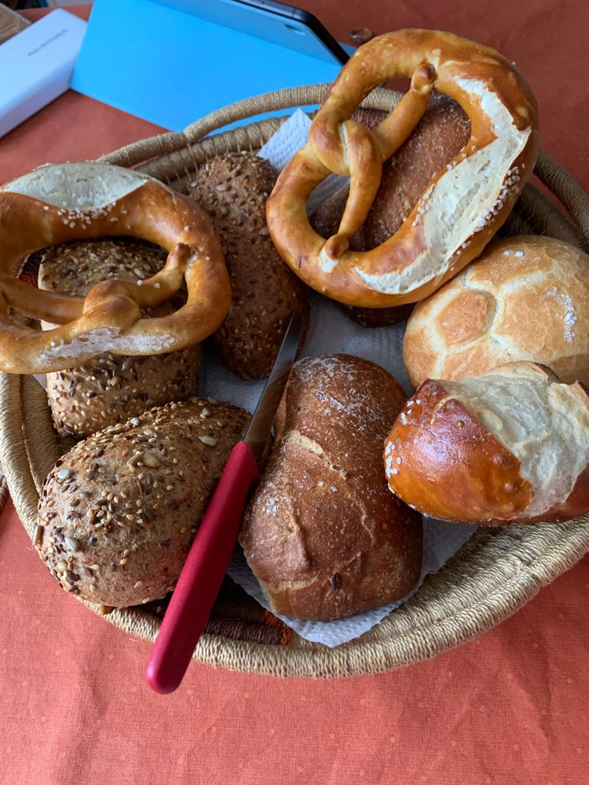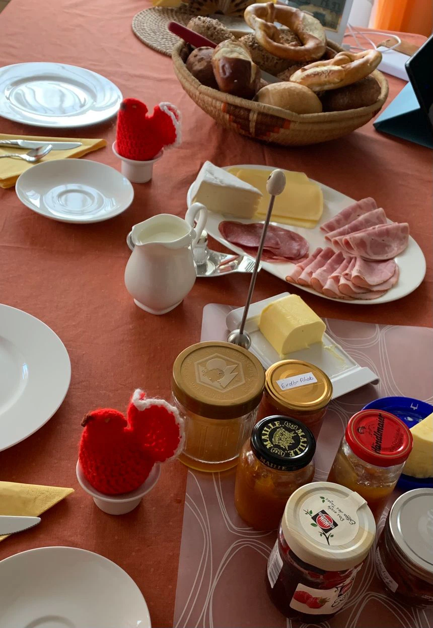 독일의 브런치 또는 브랙퍼스트를 이미 좋아하게 된 스티븐은 우리가 처음 같이 독일 여행할 때 일부러 주인이 독일 아침식사를 만들어주는 곳을 찾아 숙소를 정했다. 차려진 아침 식사에 흐뭇해하는 스티븐. 뭐가 저리 좋을까 하고 식탁을 내려다보니 세상 화려하다. 여러 종류의 고기 슬라이스, 햄 슬라이스처럼 생겼으나 햄은 아니고 요리된 고기의 슬라이스다. 중간에 콩 같은 것이 박혀 있는 것도 있고, 나는 먹지 않지만 좋아하는 사람들은 맛있게 먹을 것 같이 생겼다. 치즈도 종류별로 있다. 주인아주머니가 아침에 나가 사 온 베이커리 빵, 갓 구운 프레첼 빵과, 브라운 빵, 씨앗 빵, 크로와상등. 빵에는 버터와 잼을 발라 먹는데 딸기잼, 루바브잼, 오렌지 마아말레이드, 베리잼등 종류도 다양하고 특별히 맛이 좋다. 우리는 여기서 인생 잼도 찾았다.