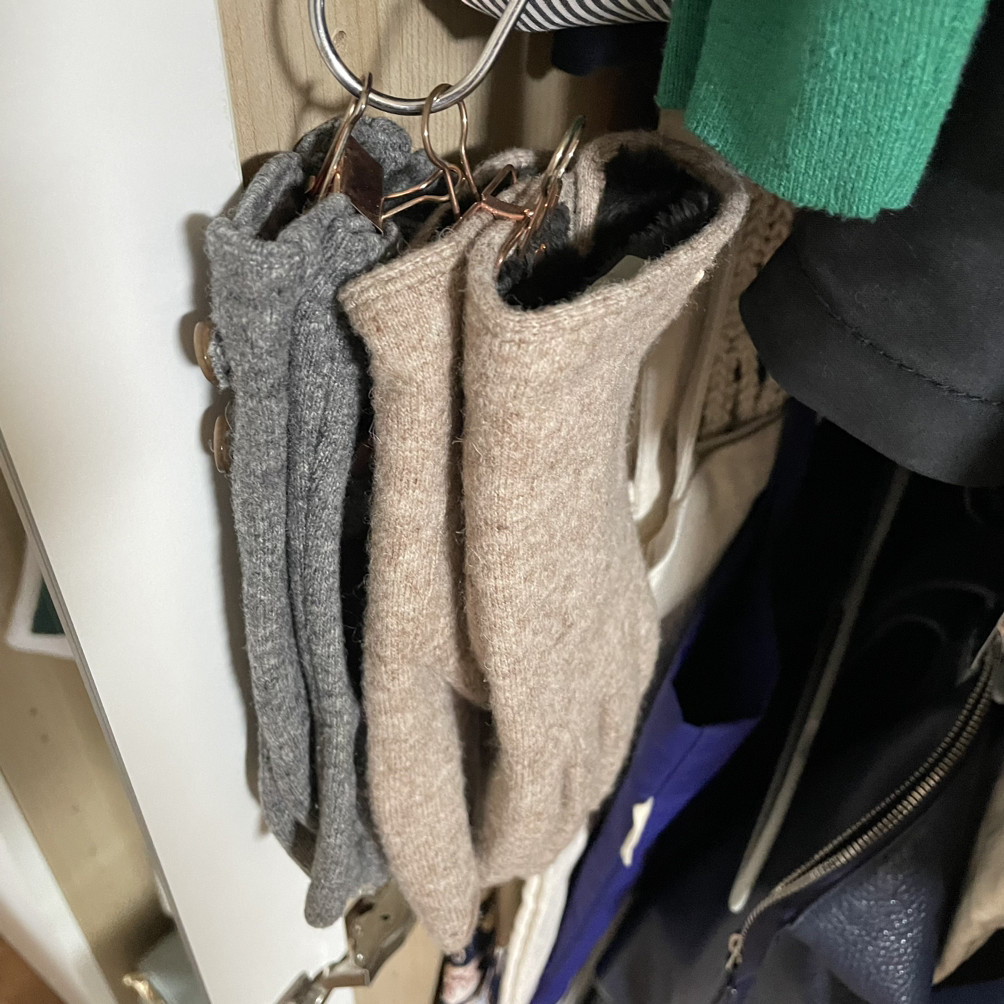 좁은 집에 살면 수납공간 확보를 위해 온갖 아이디어를 짜내게 된다. 옷이야 걸면 되고 개면 되지만 가방이나 스카프 모자 같은 자잘한 것들이 정리하기 더 어렵다. 손 트는 게 싫어서 장갑을 챙겨 끼는데 맨날 신발장 위에 얹어 놓기 뭐해서 찾은 방법. 바깥쪽에 날이 닿으면 자국이 남으니 꼭 날을 안쪽으로 해서 집어 두자.