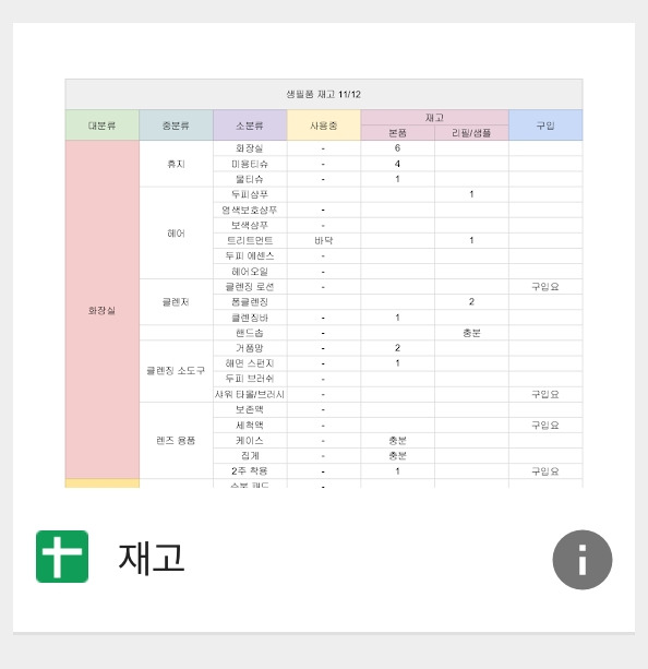 매달 급여일 즈음해서 생활용품 재고파악을 한다. 엑셀로 파일을 만들어 두고 매달 업데이트 하는 식이다. 재고래 봤자 별 거 없지만 있어야 할 때 떨어지면 불편한 것들을 미리미리 파악해 두는 거다. 그러고 나서 구매가 필요한 것들을 장바구니에 담아두고 한꺼번에 주문한다. 올해 들어 시작한 방법인데 확실히 충동 구매가 줄었다. 덩달아 수납장 정리도 하게 되니 나름 일석이조랄까. 그리고 소용량으로 조금씩 사면 큰돈이 아니라 덥석덥석 사게 되는데 한 번에 구매하면 금액이 커서 더 조심하게 되더라.