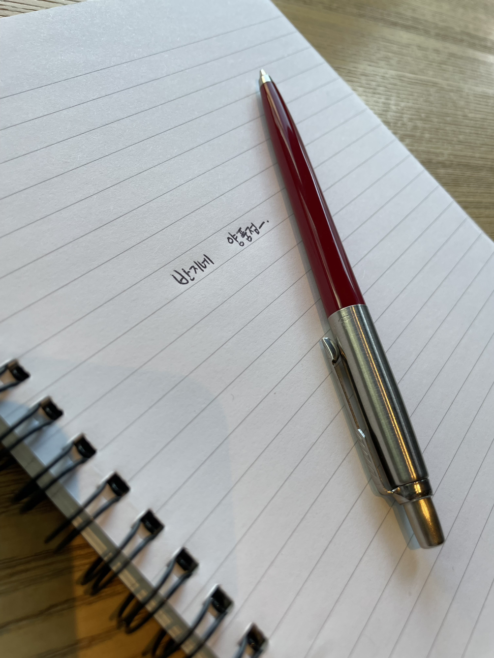그런 소리를 들었으면서도 나는 손으로 쓰는 행위를 좋아한다. 꾹꾹 눌러쓴 종이의 빠시락 소리가 좋다. 오랫동안 펜을 잡은 후 저릿한 손가락의 느낌도 좋다. 펜을 고르는 기준도 나름 까다롭다. 일단 촉이 너무 가는 펜은 곤란하다. 정말 종이가 찢어질 만큼 눌러쓰는 터라 바늘로 글씨를 쓰는 기분이 든다. 뭘 잘 흘리고 쏟으니 수성펜도 곤란하다. 유성펜이나 중성펜으로 0.5mm 이상의 굵기. 조건을 만족하는 몇 가지 제품을 업무용 및 공부용으로 쓰고 있는데 이외에 뭔가 '있어 보이는 펜'이 가지고 싶어졌다. 라미 볼펜을 꽤 오래 쓰다 파카 볼펜을 선물로 받은 이후에는 여기 정착했다. 살짝 뭉개지듯 굵은 펜촉은 악필을 가리기에도 용이하고, 나름의 역사와 전통을 가진 볼펜이라 내 주제에 이 정도면 몽블랑이나 다름없지 뭐.