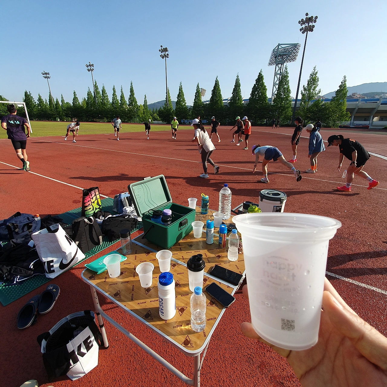 저는 대회 이후 다회용 컵을 지원받아 제가 속한 러 닝 모임에서 운동 중 수분섭취 시 일회용 종이컵 대신 다회용 컵을 사용하기 시작했습니다. 먼저 팀원들에게 협조를 부탁드리고 매주 운동할 때마다 다회용 컵을 가지고 가서 종이컵 대신 사용하고 집에 가져와서 세척하고 다시 사용하는 것을 반복했습니다.