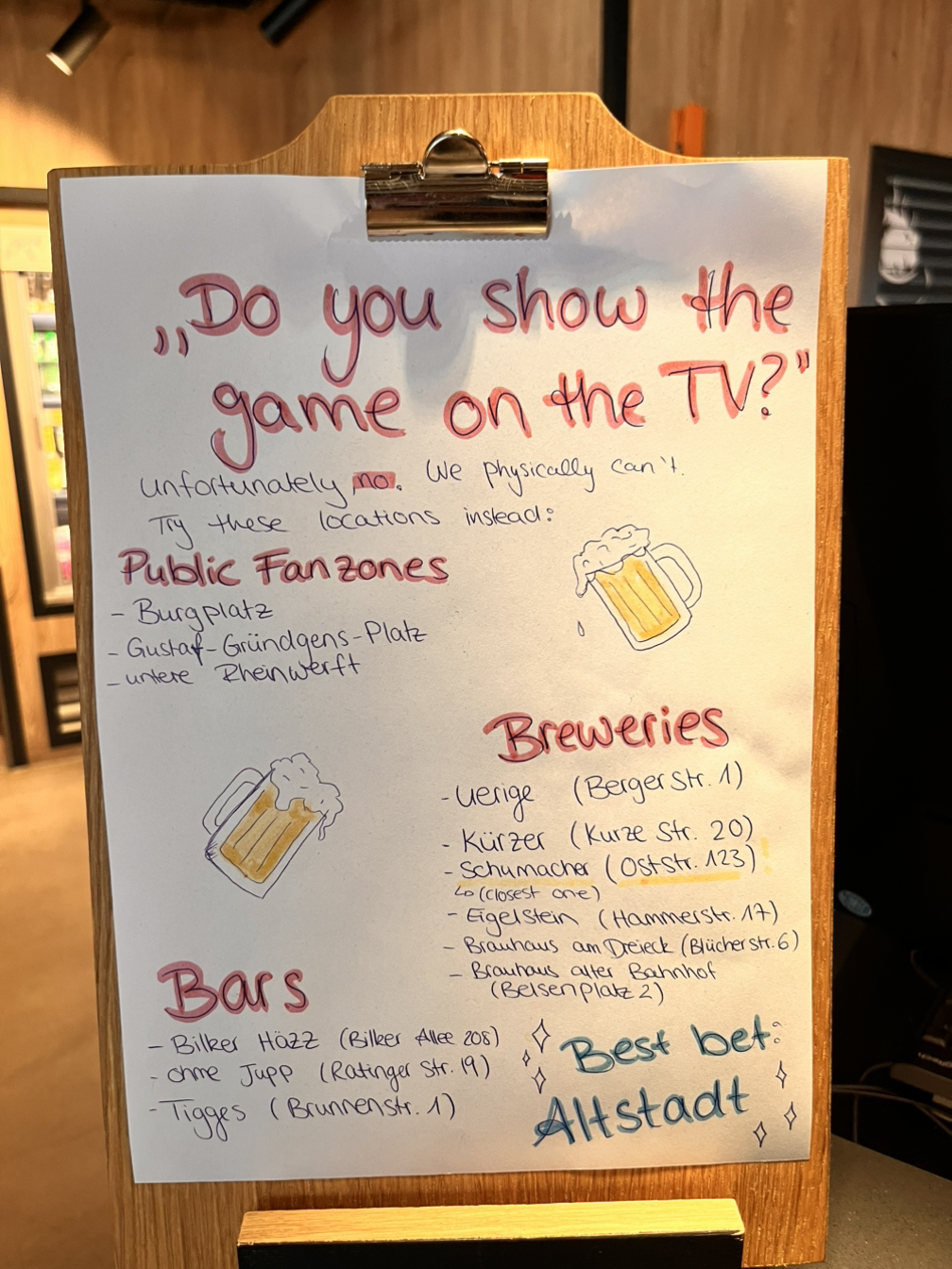 독일의 일요일은 상점들이 대부분 문을 닫는다. 대비 없이 맞이한 일요일에 관광객들이 많이 당황할 수 있는데, 그럴 때는 케밥, 쌀국수를 기억하면 된다. 장사에 진심인 터키와 중국 사람들은 일요일에도 가게를 열기 때문이다. 추가로 정말 급할 때라면 역 근처의 REWE to-go 매장을 찾으면 상품이 많지는 않지만 생필품 정도는 구매할 수 있다. 나는 케밥집을 찾아 치킨 Dürum을 하나 사먹었다. 분명 케밥은 터키음식인데 독일케밥이 더 맛있다. 이런 현상은 나만 느끼는 게 아니고 인터넷 밈 중에 독일 케밥은 독일음식이라고 주장하는 일도 있다고 한다. 케밥을 먹고 유로2024 결승전 한시간 전 쯤 맞춰 레베투고에서 Lebienz과자와 제로콜라정도 구매해서 Public viewing 장소로 이동했다.